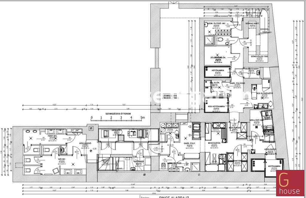 A földszinten található vendégtér és konyha mellett az alagsorban kapott helyet a teljes háttérkiszolgáló részleg, beleértve a raktárakat, hűtőkamrákat, előkészítő helyiségeket, szociális blokkot és mosdókat.