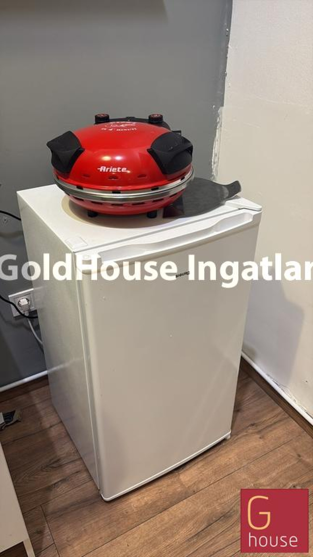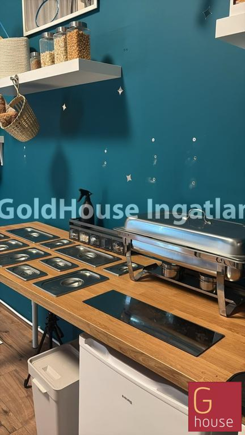 Berendezés: hűtő, mosogató, pult, székek, asztalok, elektromos pizzakészítő gép, szendvics és krumplisütő, rezsó, kávédaráló, kávégép, melegen tartó pult, állványok, egyéb konyhai eszközök.