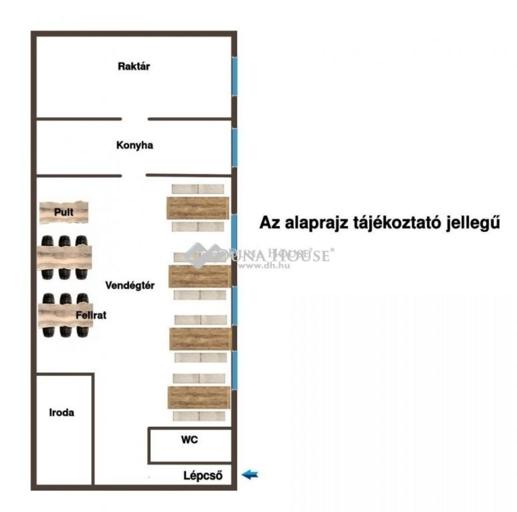 A hely alkalmas sörözőnek, pubnak, vagy más vendéglátó egységnek is. A belső tér bővíthető az iroda + WC résznél. Amennyiben ennél nagyobb helyre lenne szükség, akkor az is rendelkezésre áll, mert a szomszédos alagsori résszel bővíteni lehet. Ez természetesen nem képezi a jelenlegi vételárat!