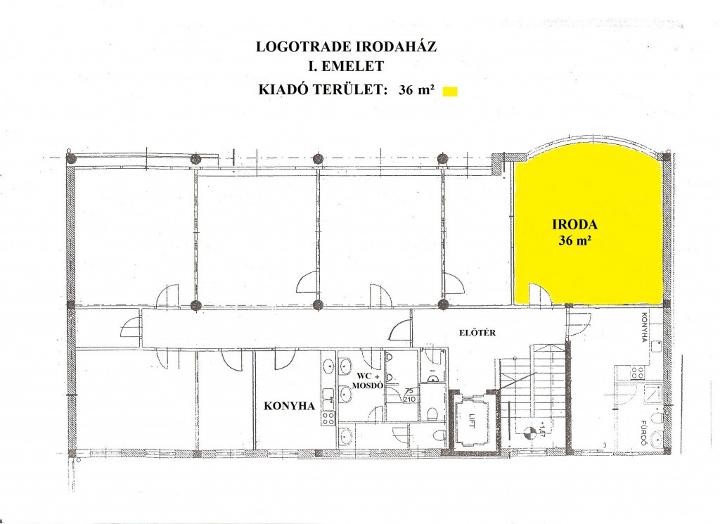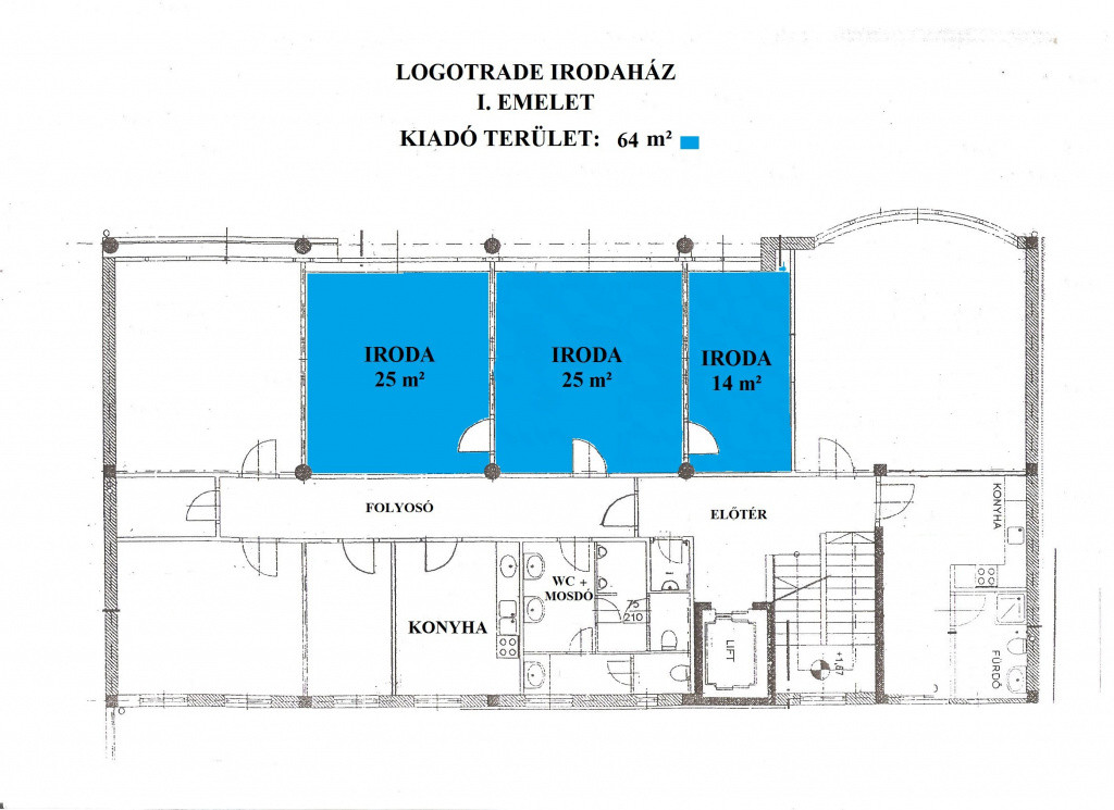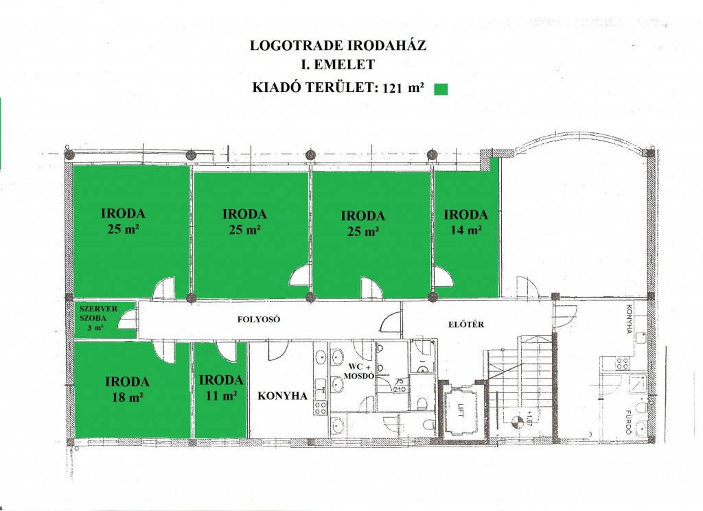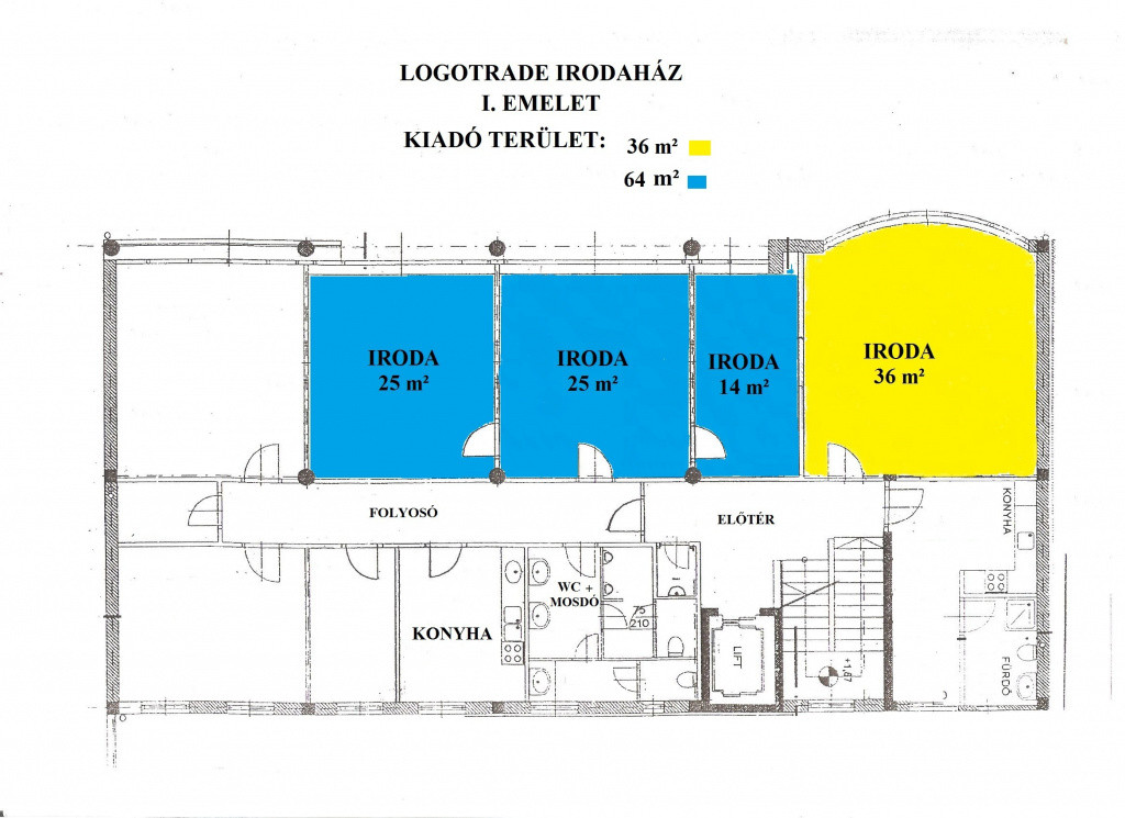 Budapesten, XIII. kerületben a Röppentyű utcában tégla építésű irodaházban I. emeleti üres irodaszintjén kiadó irodák: