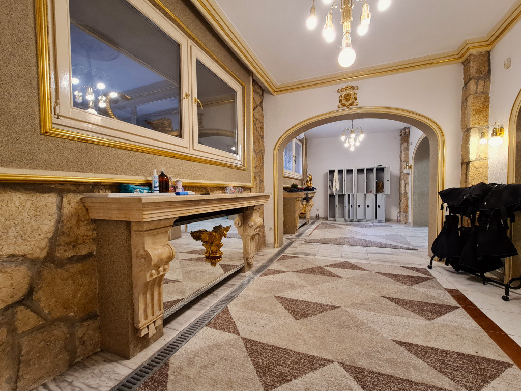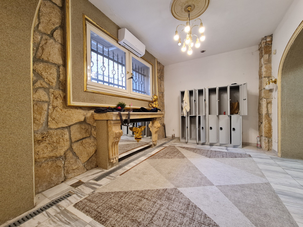 Az alagsori ingatlanban nem csak az edzőterem található, hanem a hozzá szükséges kiszolgáló helyiségek is, mint például a recepció pulttal, az ügyfél-várakozó fotelekkel, kanapéval,