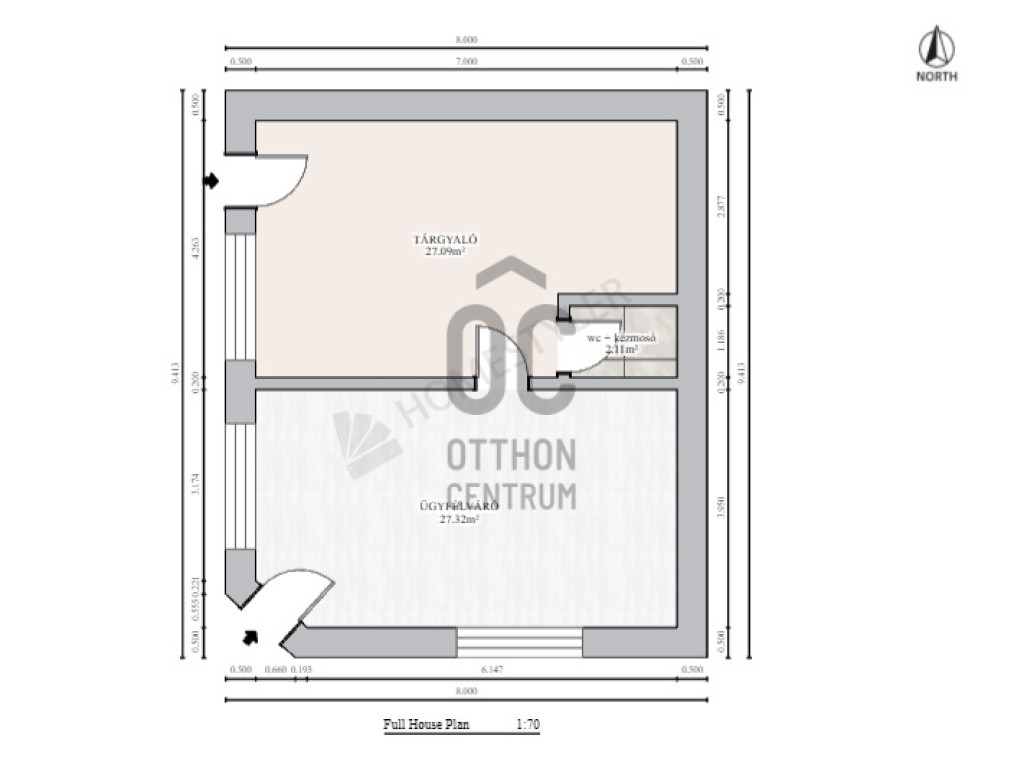 Az irodában egy 27.32 m² ügyfélváró, egy 27.09 m² belső tárgyaló konyha sarokkal, valamint egy 2.11 m² WC+kézmosó helyiség található.