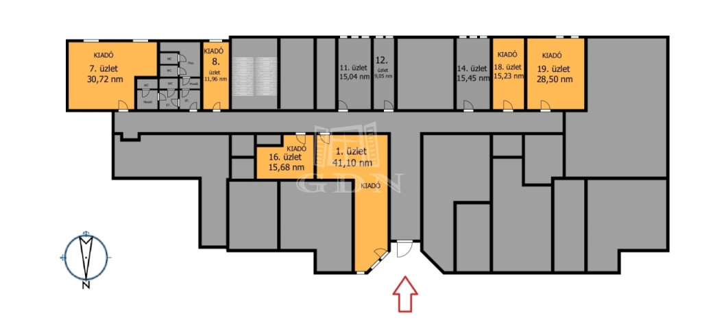 Földszinti elérhető szabad üzletek méretei: