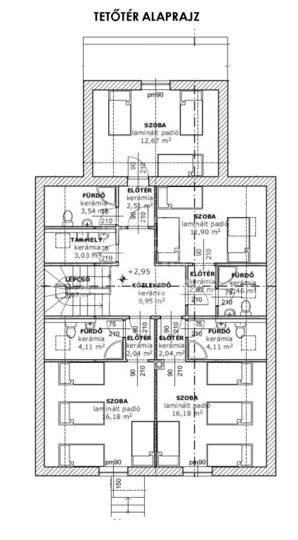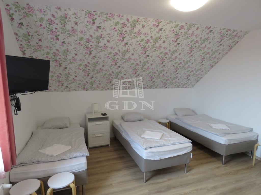 A kétszintes épület emeleten négy (2db 4 ágyas és 2db 3 ágyas), önálló fürdőszobás apartman, illetve egy teakonyha került kialakításra.