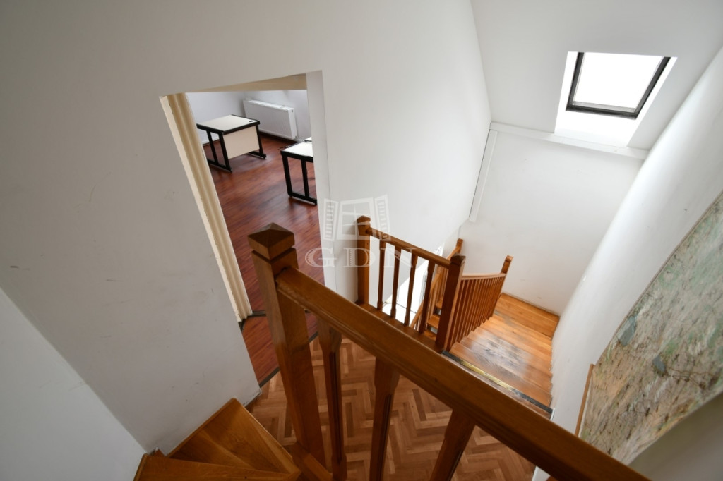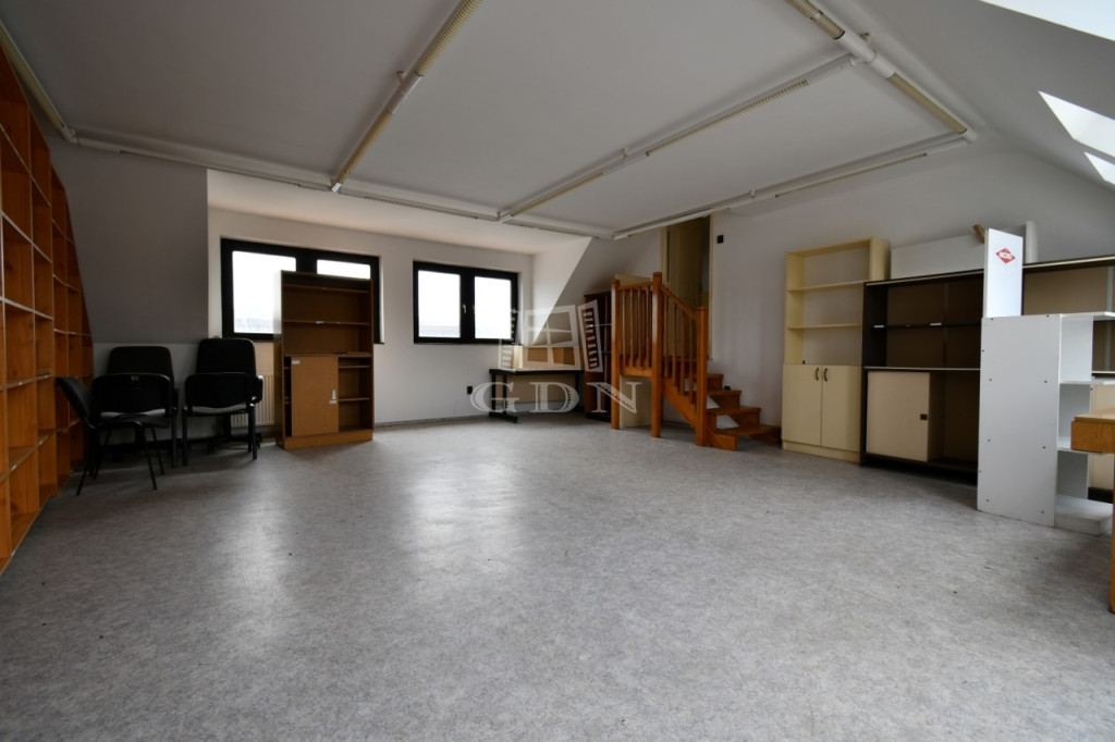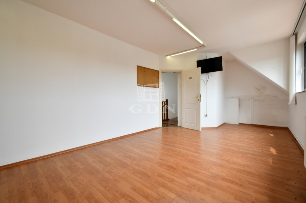 ⁃ elosztását tekintve a földszinten egy iroda/üzlethelyiségből, konyhából és két zuhanyzós mosdóból, a tetőtérben pedig 3db irodából és egy irattárból áll.