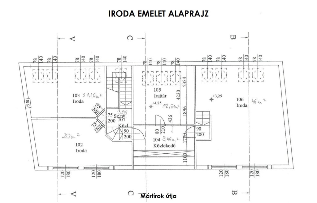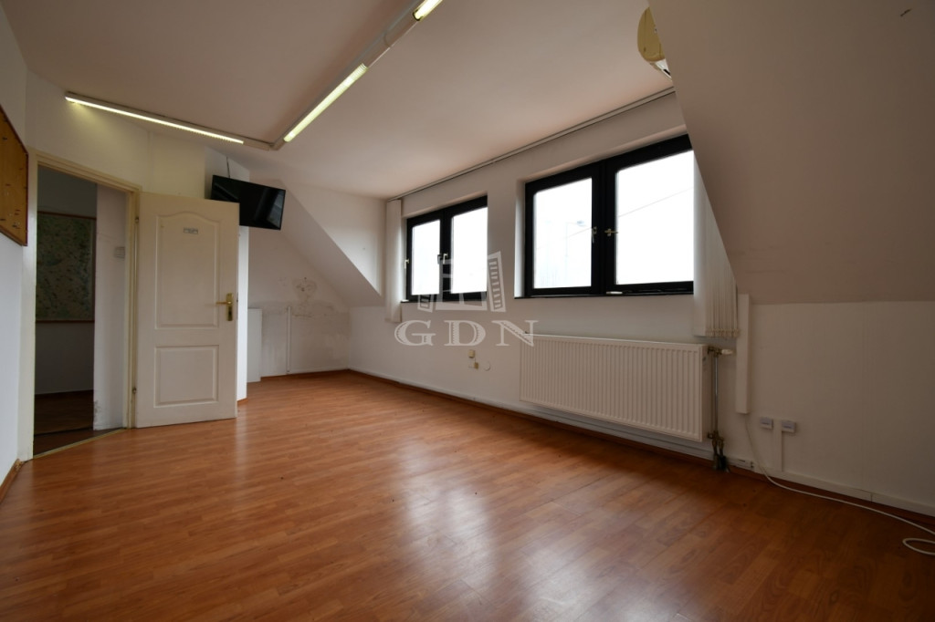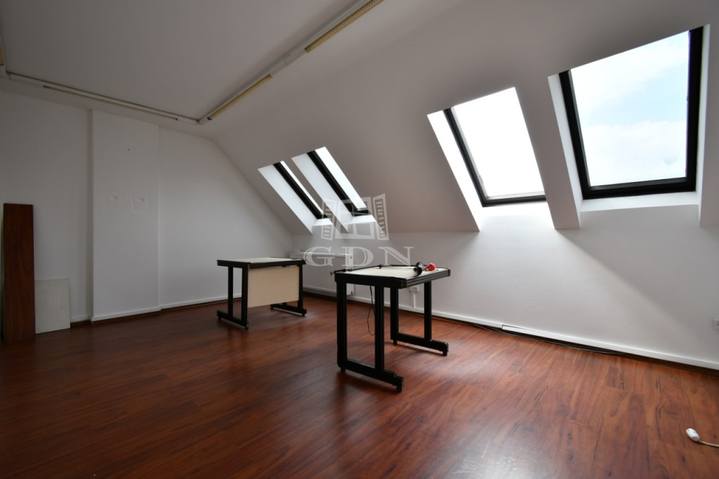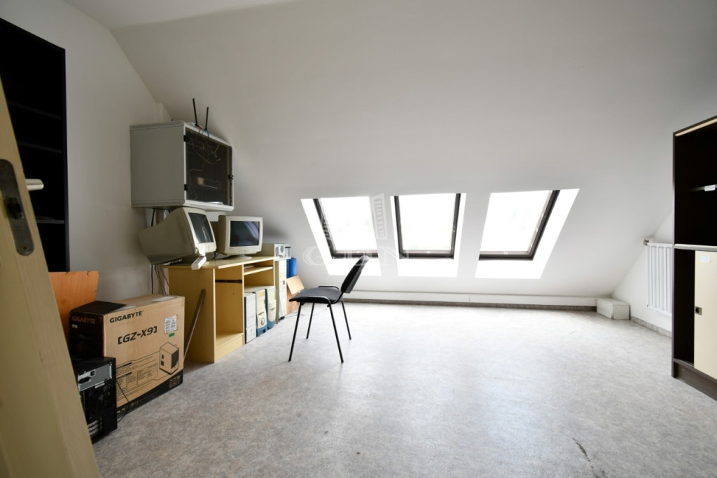‣ elosztását tekintve a földszinten egy iroda / üzlethelyiségből, teakonyhából, női/férfi wc-ből, és egy zuhanyzós mosdóból, a tetőtérben pedig 3db irodából és egy irattárból áll