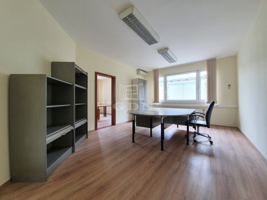 Az irodaépületben egy nagy ügyfélfogadó / recepciós tér, kis teakonyha, női-férfi wc, kiszolgáló helyiség zuhanyzóval, egy kéziraktár és 5 db önálló irodahelyiség került kialakításra. Minden irodahelyiség klimatizált, bútorozott, jó állapotúak.