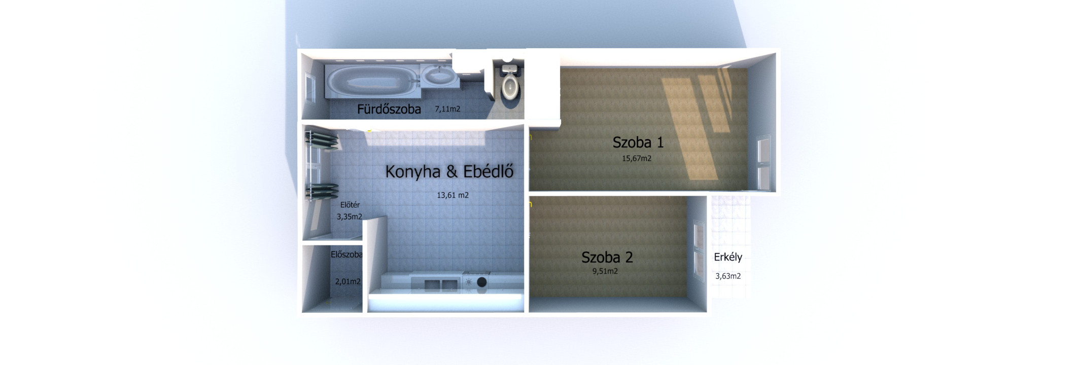 A lakás két különálló szobával és egy tágas, konyhával és étkezővel rendelkezik.
