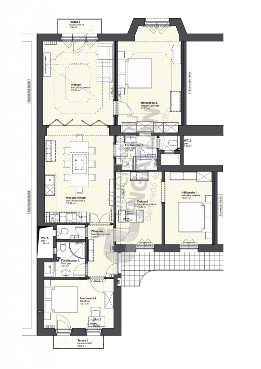 Tágas étkezőkonyha és nappali, három külön nyíló hálószoba, két fürdőszoba és egy vendég-WC szolgálja a lakók kényelmét.