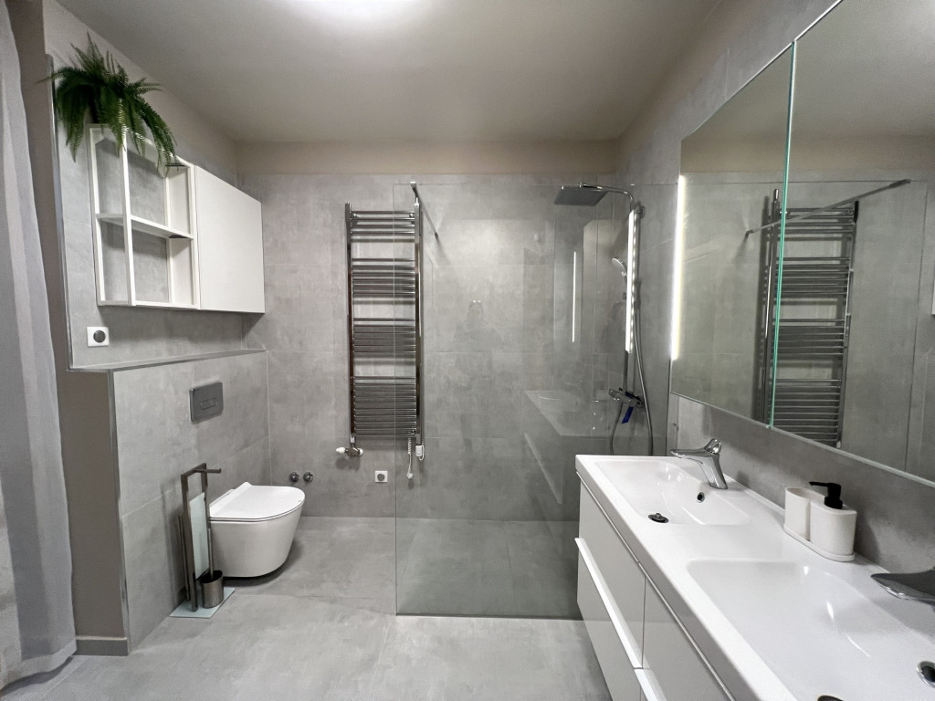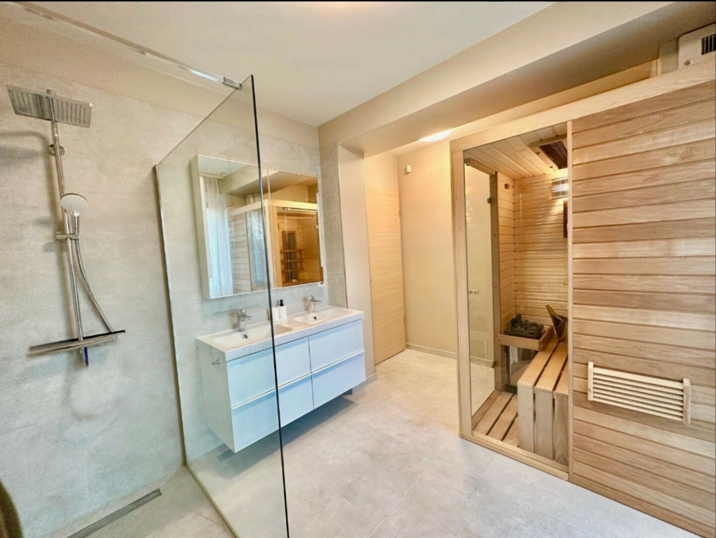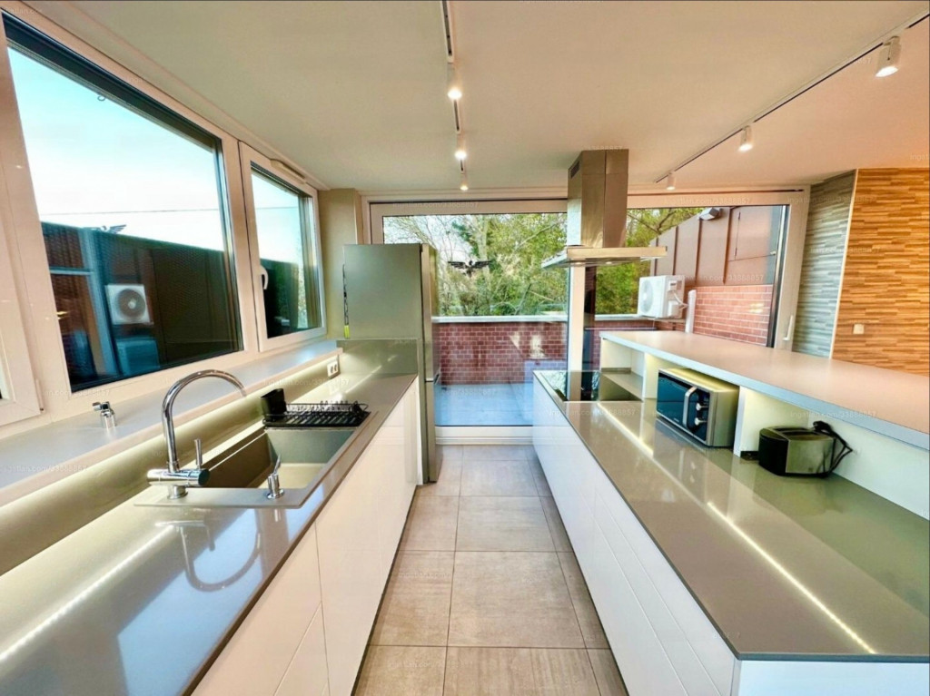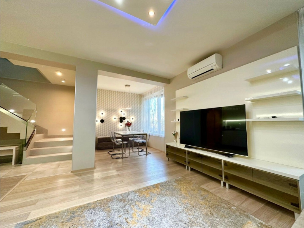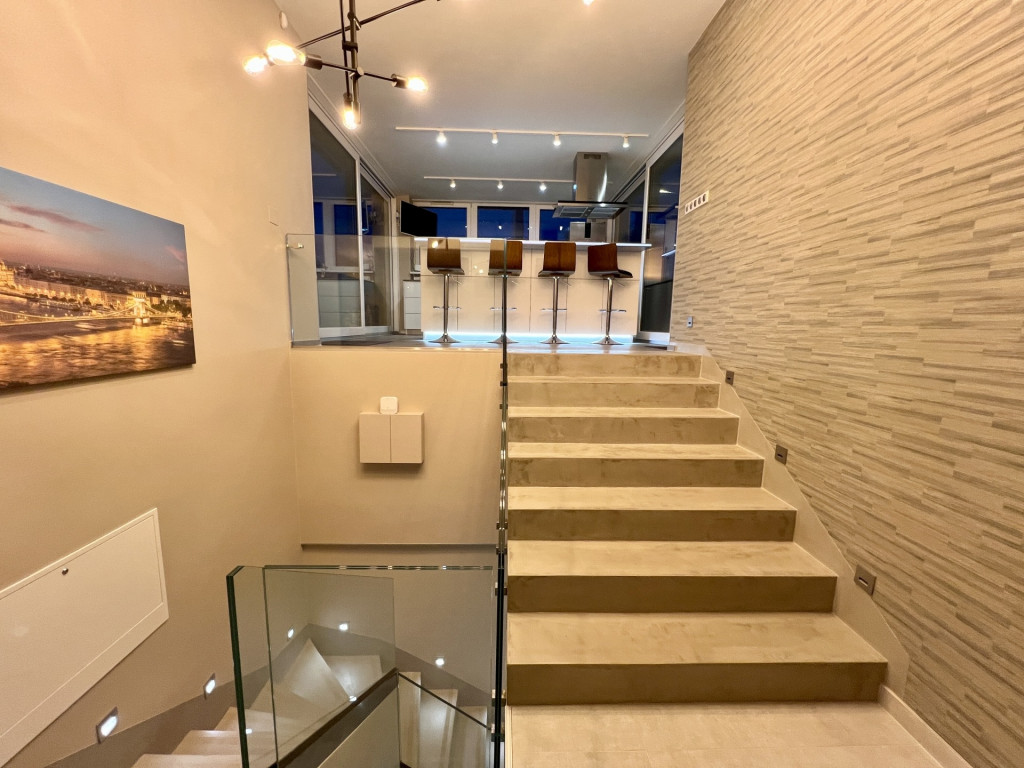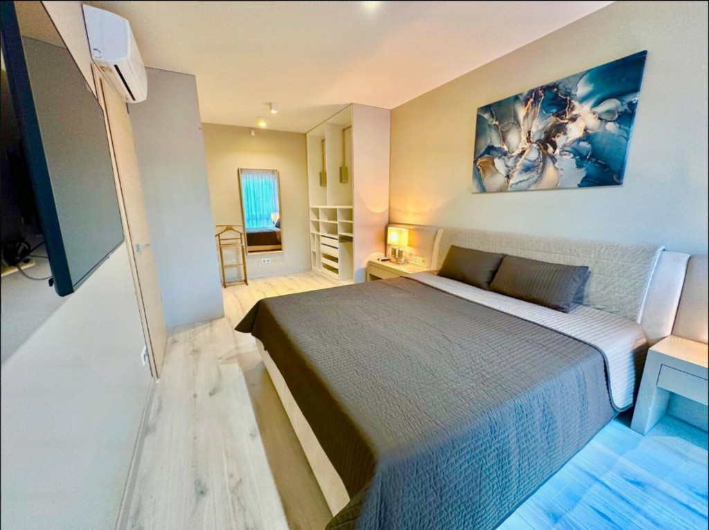 A lakás minőségi bútorokkal berendezett, gépesített, minden helyiség klímával felszerelt.