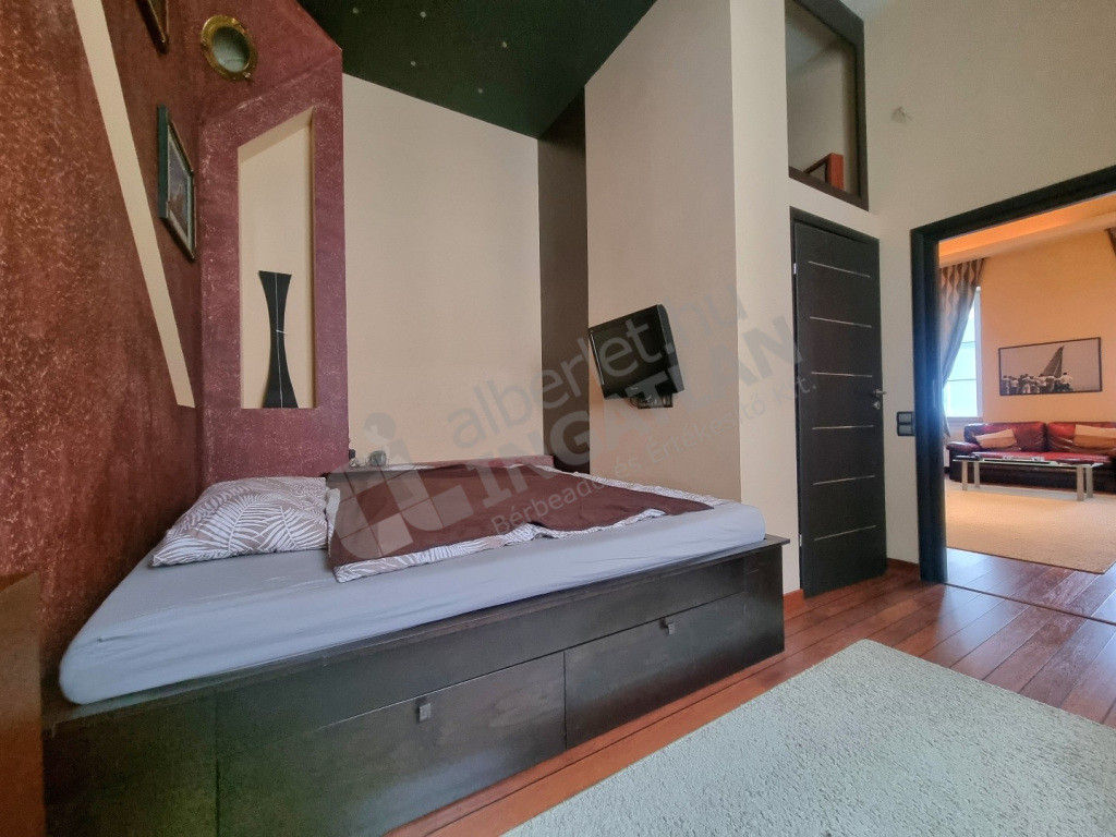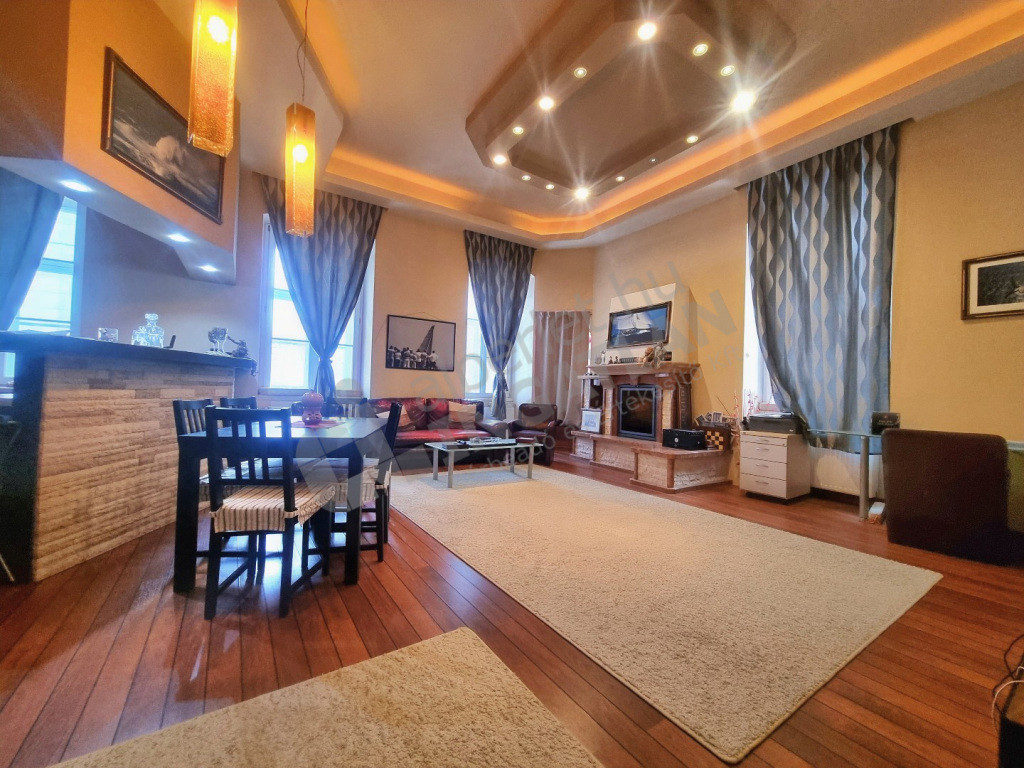 The property features a spacious room and a living room with an American kitchen. The 320 cm ceiling height and the south-east orientation provide bright, elegant spaces. The apartment has a panoramic view, heating and hot water supply is solved with a circulating system, and it is air-conditioned.