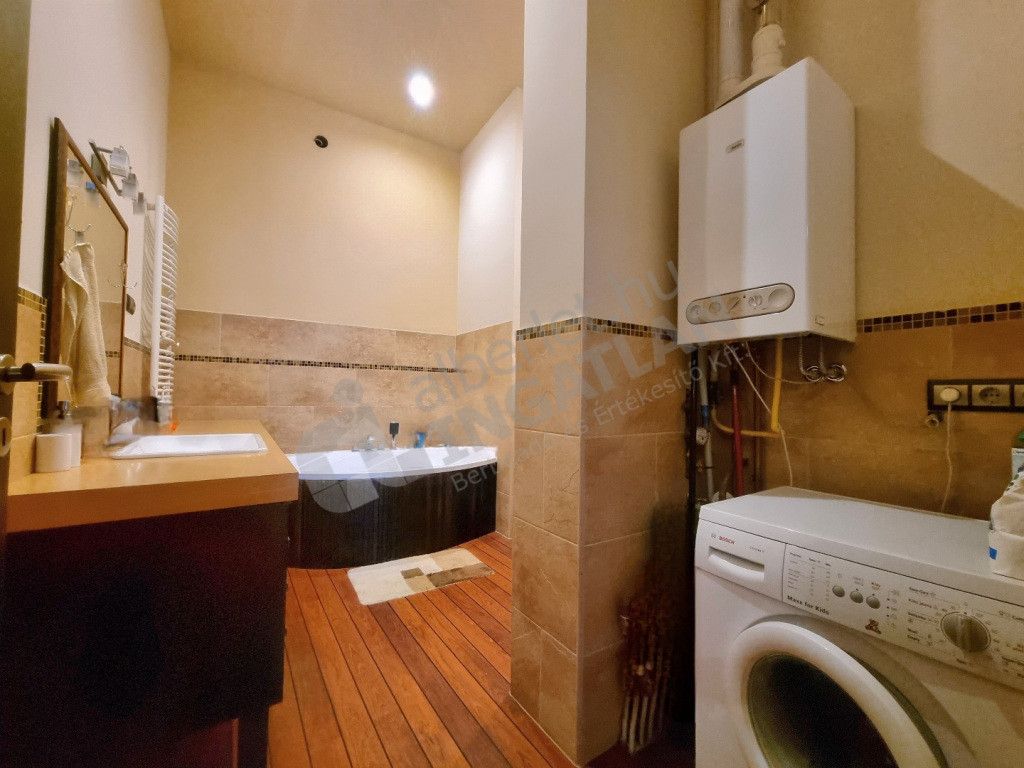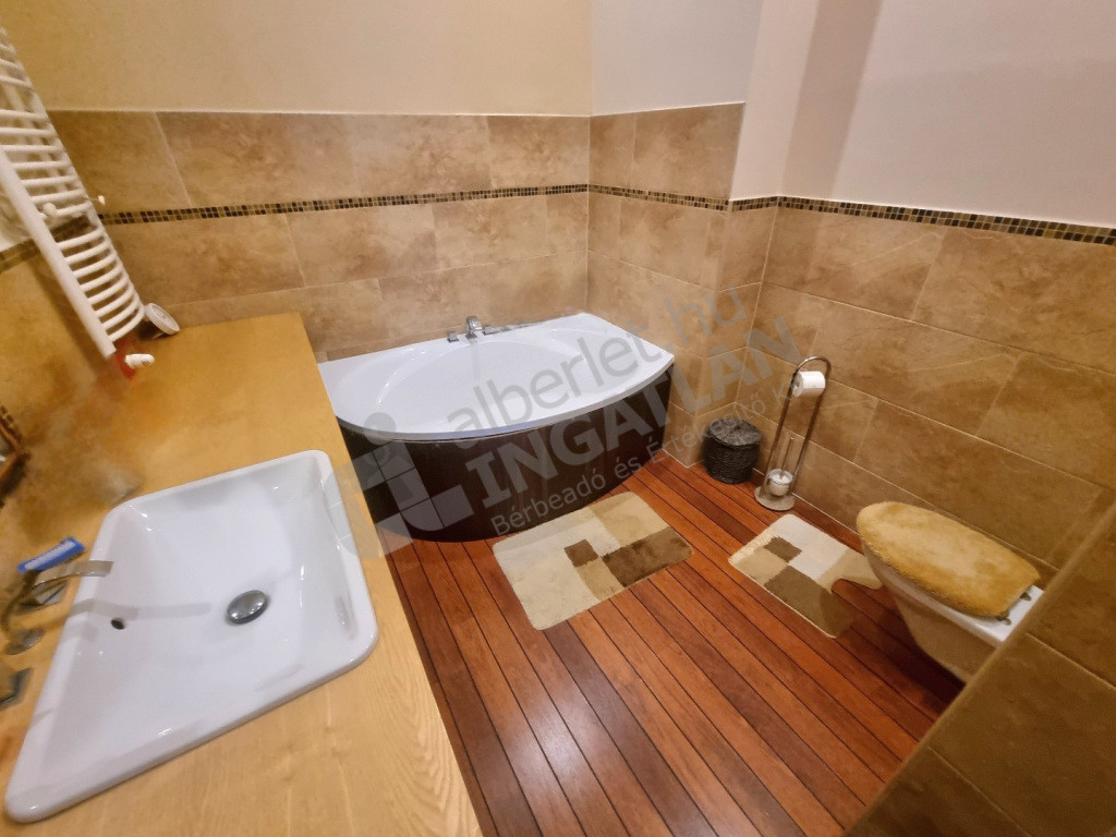 A fürdőszoba káddal felszerelt, WC-vel egyben. A lakás irodai célra is alkalmas. Parkolás közeli parkolóházban bérelhető.