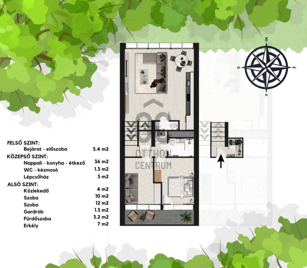 - A nappali két ház közötti zöld udvarra néz, tájolása nyugati.