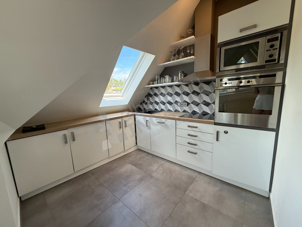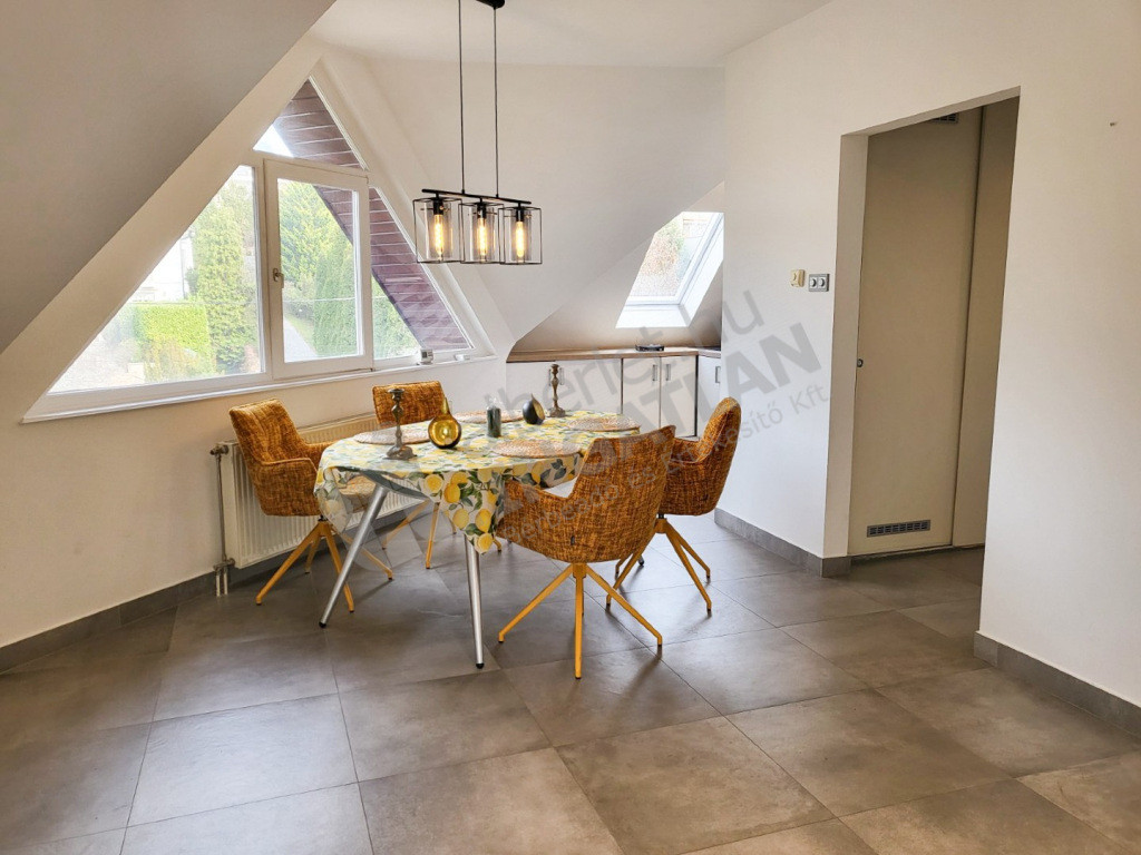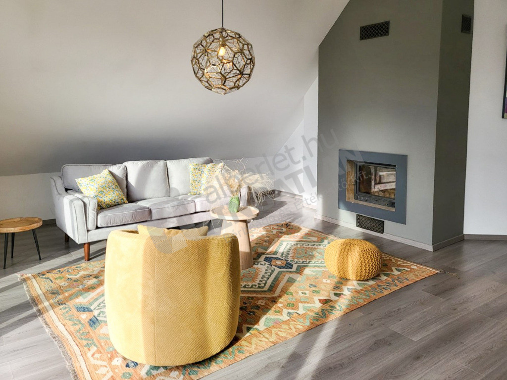 The spacious, bright living room of the apartment is made really special by huge glass surfaces and direct terrace connection. The panorama from the six-square-metre terrace creates an unparalleled atmosphere – the perfect place for a morning coffee or evening relaxation. The property has been exquisitely renovated and features a modern, mechanized kitchen and an elegant bathroom with a bathtub and a separate shower. The cosy atmosphere of the living room is ensured by its own fireplace, and the larger bedroom has its own walk-in closet, which further increases comfort and practicality.