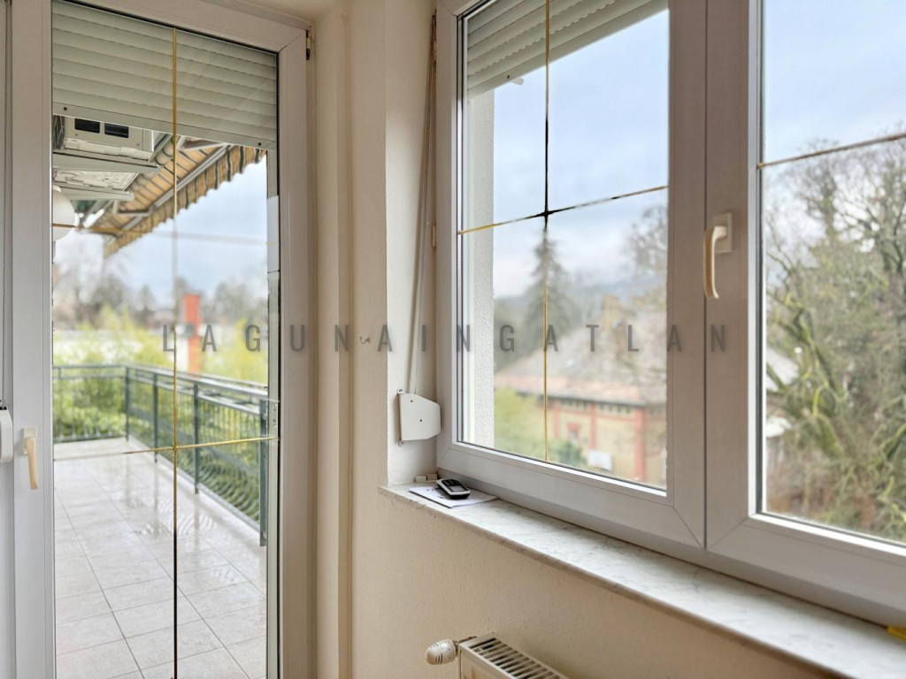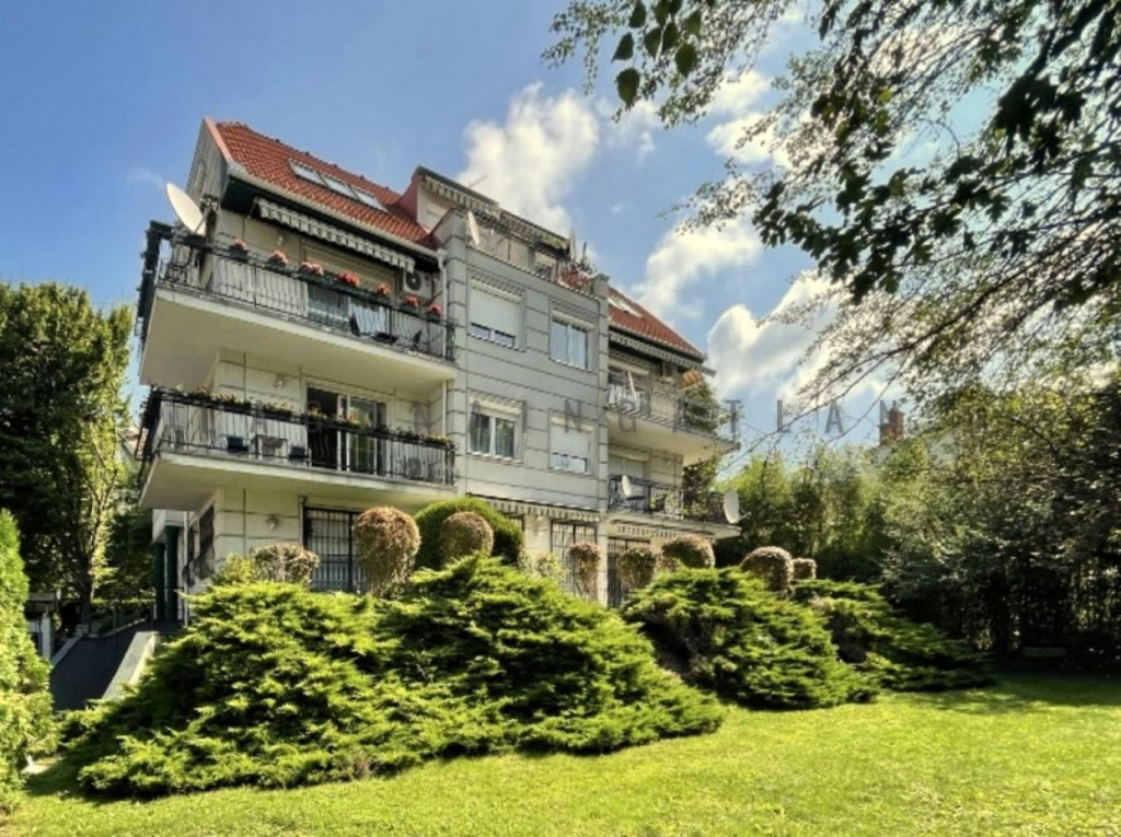 Tágas, napfényes, egy szintes lakás kertre néző és szép kilátással rendelkező terasszal.
