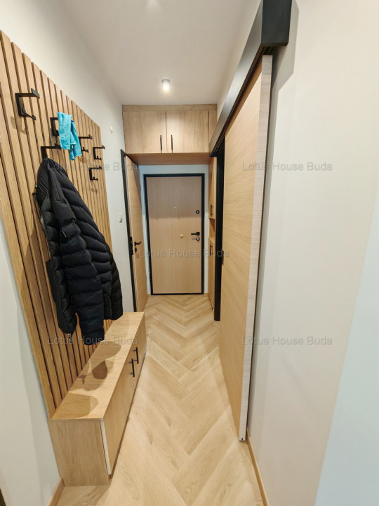A lakásba belépve az előtérbe érünk, amely egy légtérben található az amerikai konyhás nappalival. A bejárattól balra található a háló, míg jobbra a fürdő és a gardrób. A lakás helyiségei jól használhatók, kényelmesen berendezhetők. A lakáshoz szélesebb franciaerkély is kapcsolódik. A konyha teljes egészében gépesített (kombinált beépített hűtő, mosogatógép, beépített mikró, kombinált elektromos tűzhely), a gépek újak, még nem voltak használva. A mosógép a fürdőben kapott helyet, ahol épített zuhany és mosdó nyújt kényelmet.