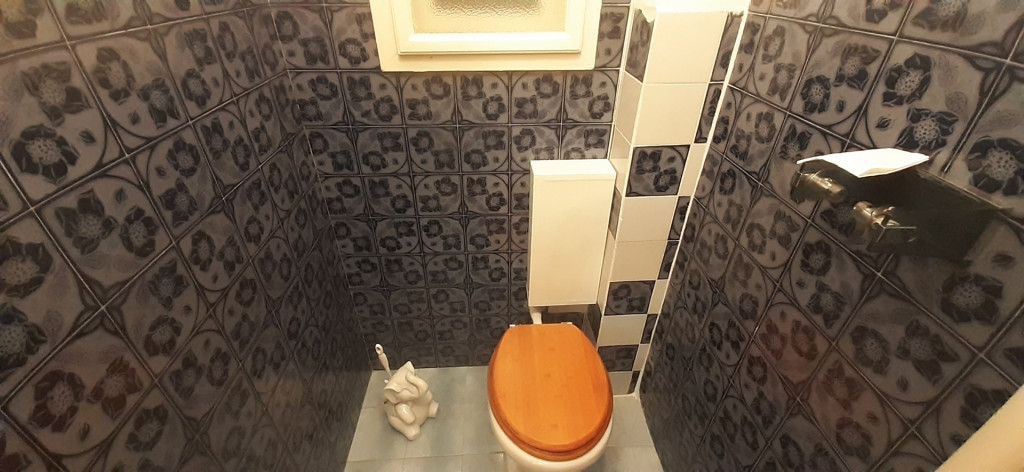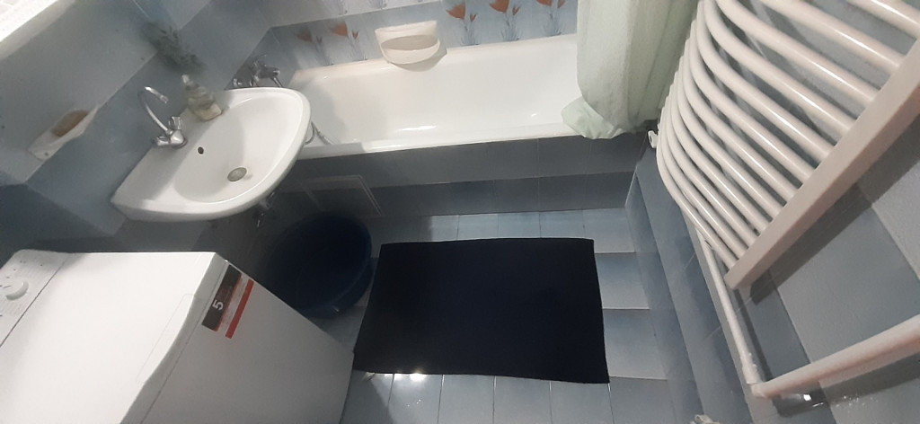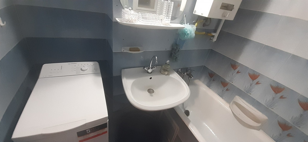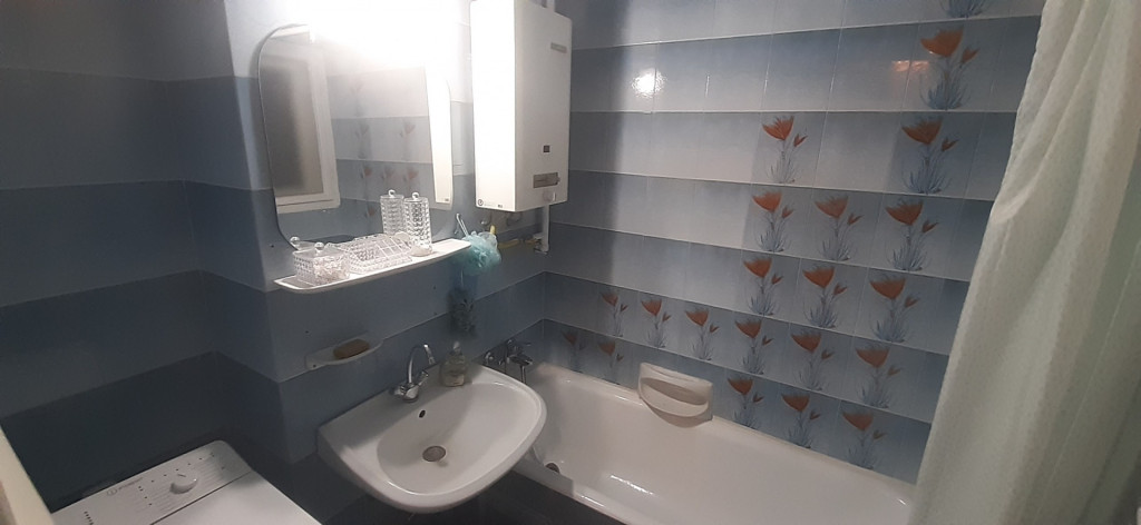 A fürdőszoba zuhanyzós, mosógéppel felszerelt, a wc külön bejáratú.