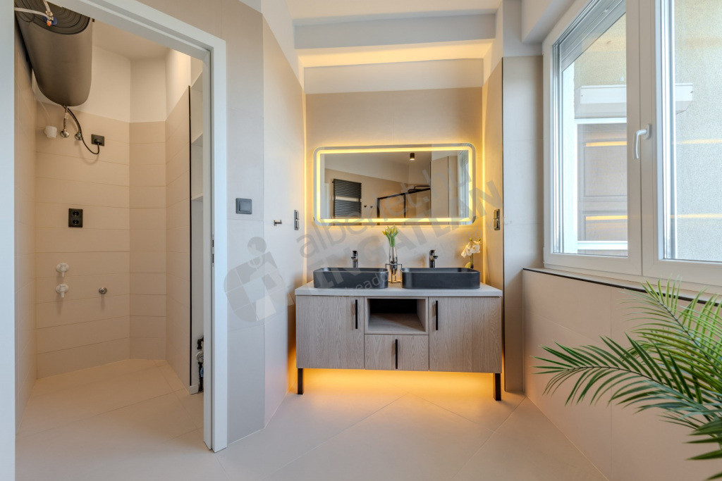 - Fürdőszoba két mosdókagylóval és kényelmesen tágas zuhanyzóval