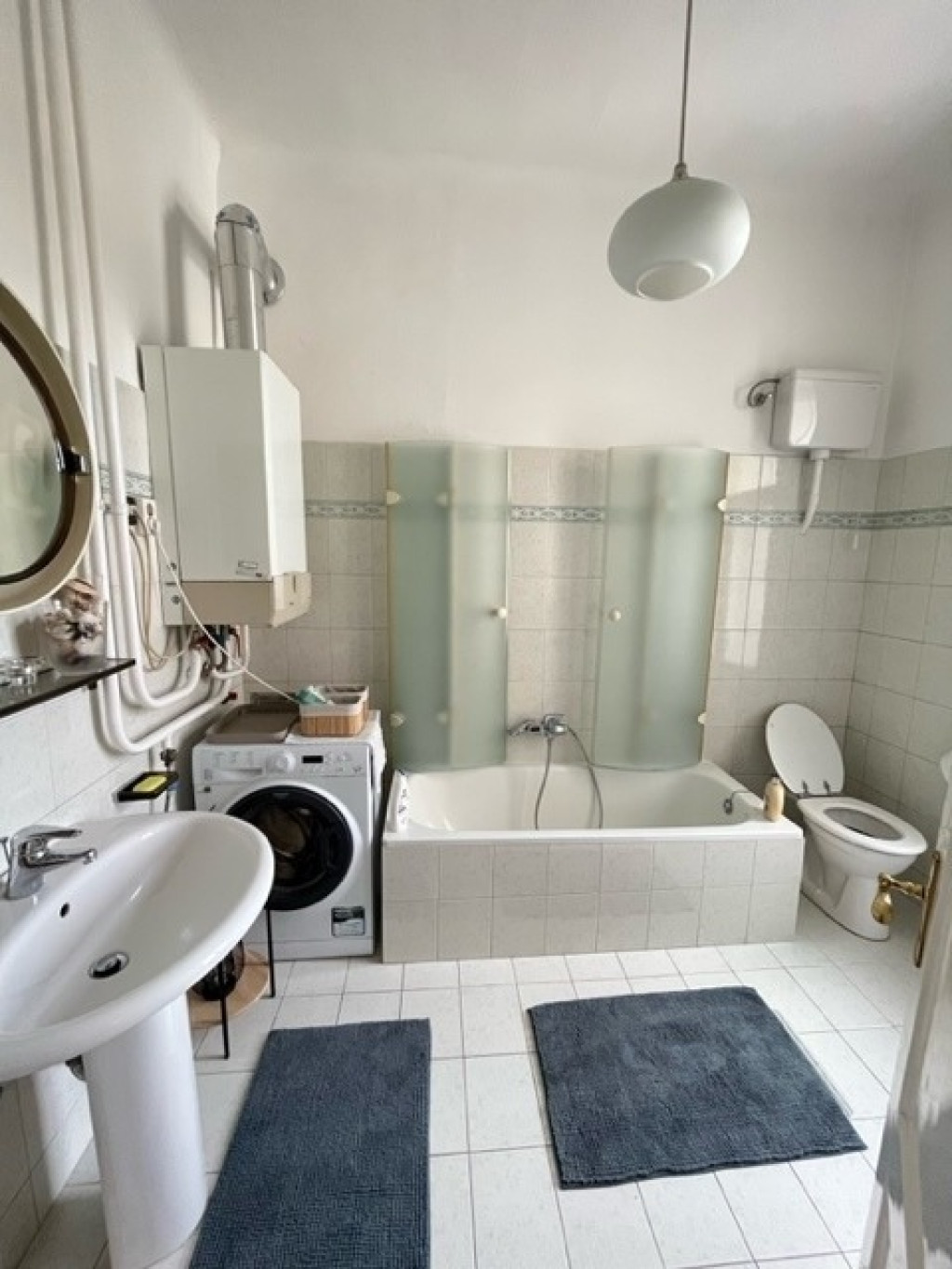 A fürdőszoba káddal és mosógéppel felszerelt, a konyha teljes körűen gépesített.