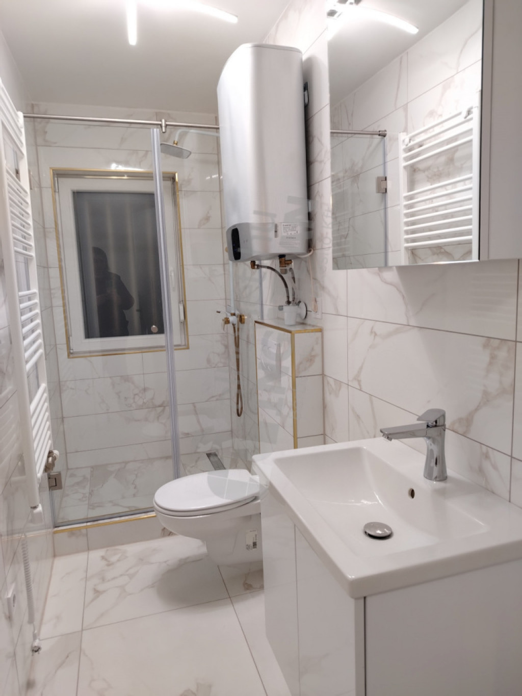 Házközponti fűtésű, a meleg vizet villanybojler biztosítja.