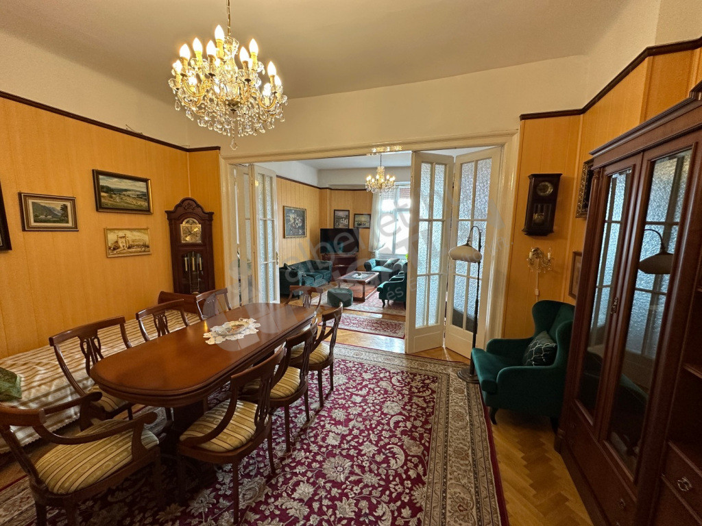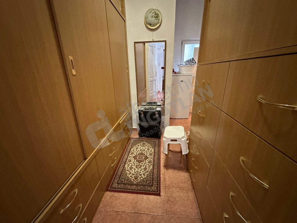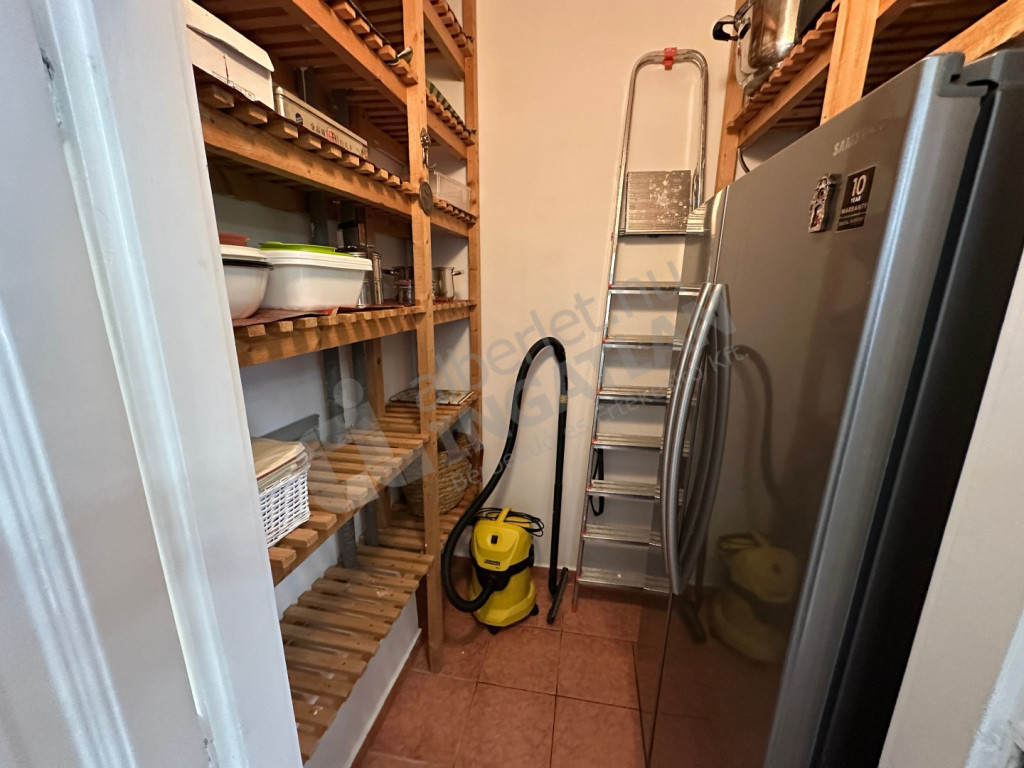 Tágas nappali-hall, hálószoba. Nagy beépített szekrények. A fürdőszobában wc, bidé, zuhanyzó és kád is van, külön még egy vendég wc kézmosóval. Kamra, gardróbszoba.