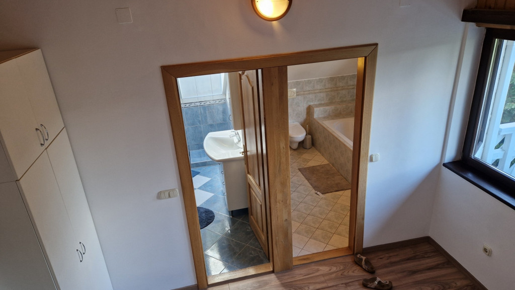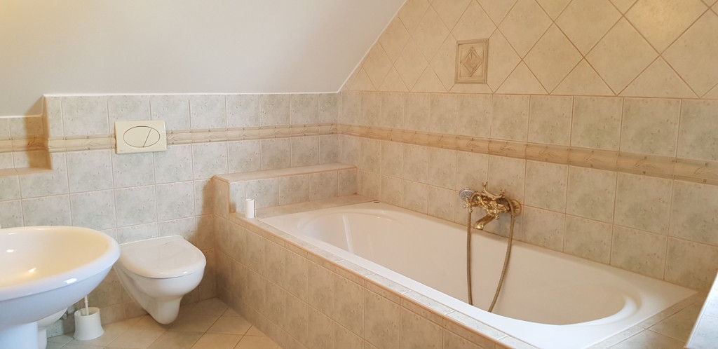 ELOSZTÁSA: dél-keleti fekvésű nappali, három hálószoba, két fürdőszoba káddal és zuhanyzóval, WC-vel mindkettő, egyikben még bidé is, és a földszinten külön WC kézmosóval.