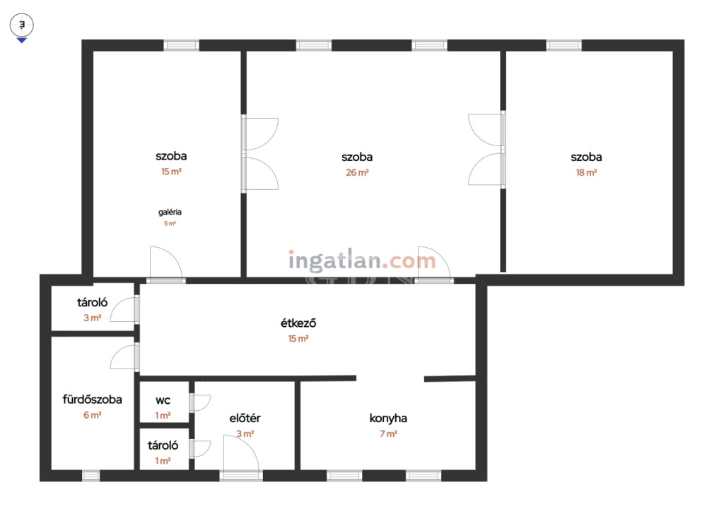 • Elosztás: nappali + 2 hálószoba, étkező–konyha