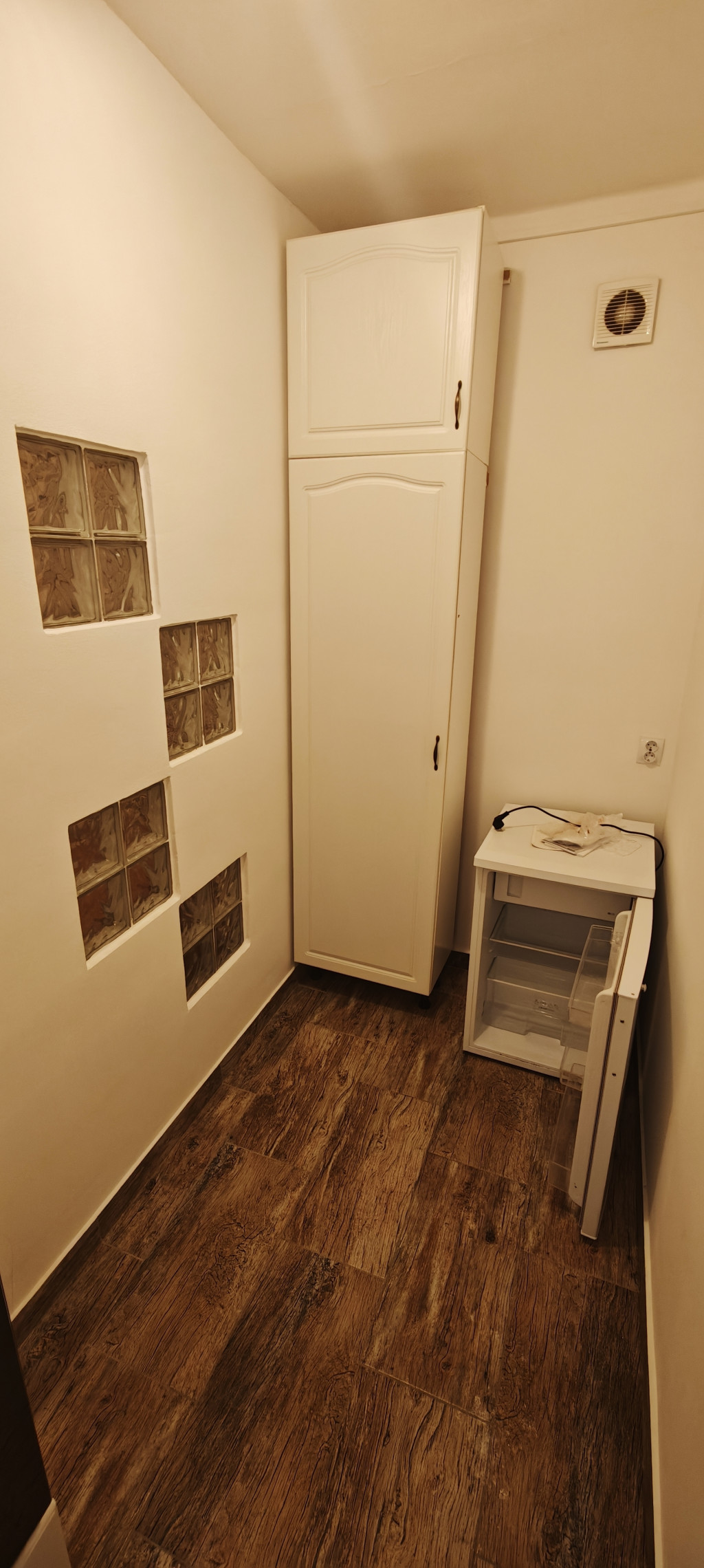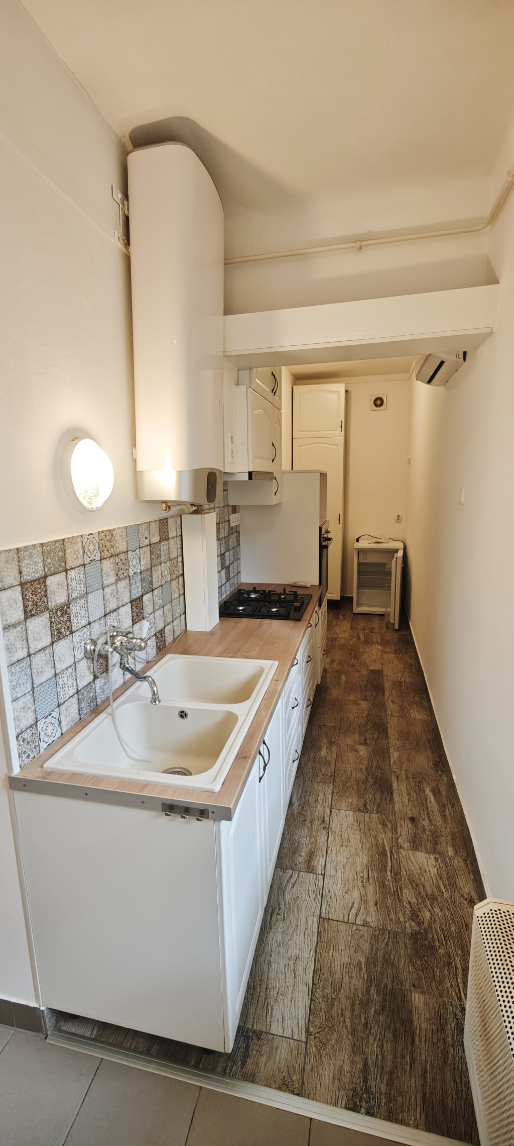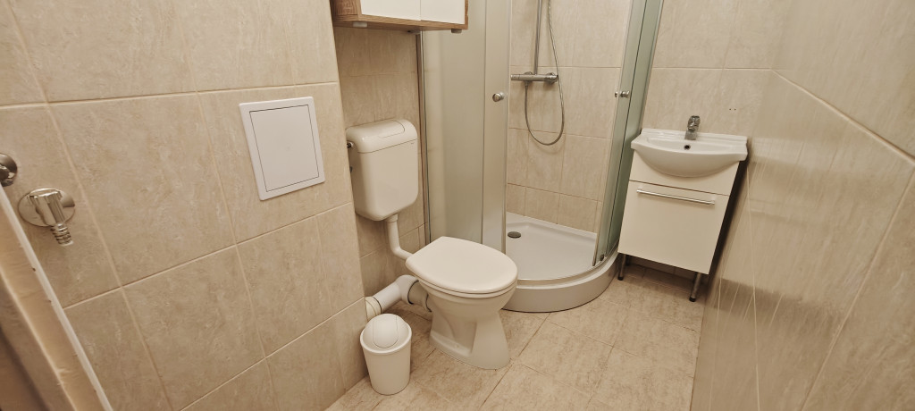 A lakás tartozéka hűtőszekrény, Bosch gáztűzhely és villany sütő. A meleg vizet Ariston villanybojler biztosítja. Az előszobában van beépített gardróbszekrény. Mosógép nincs.
