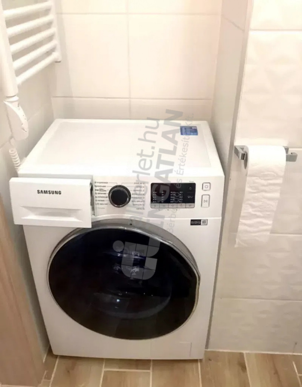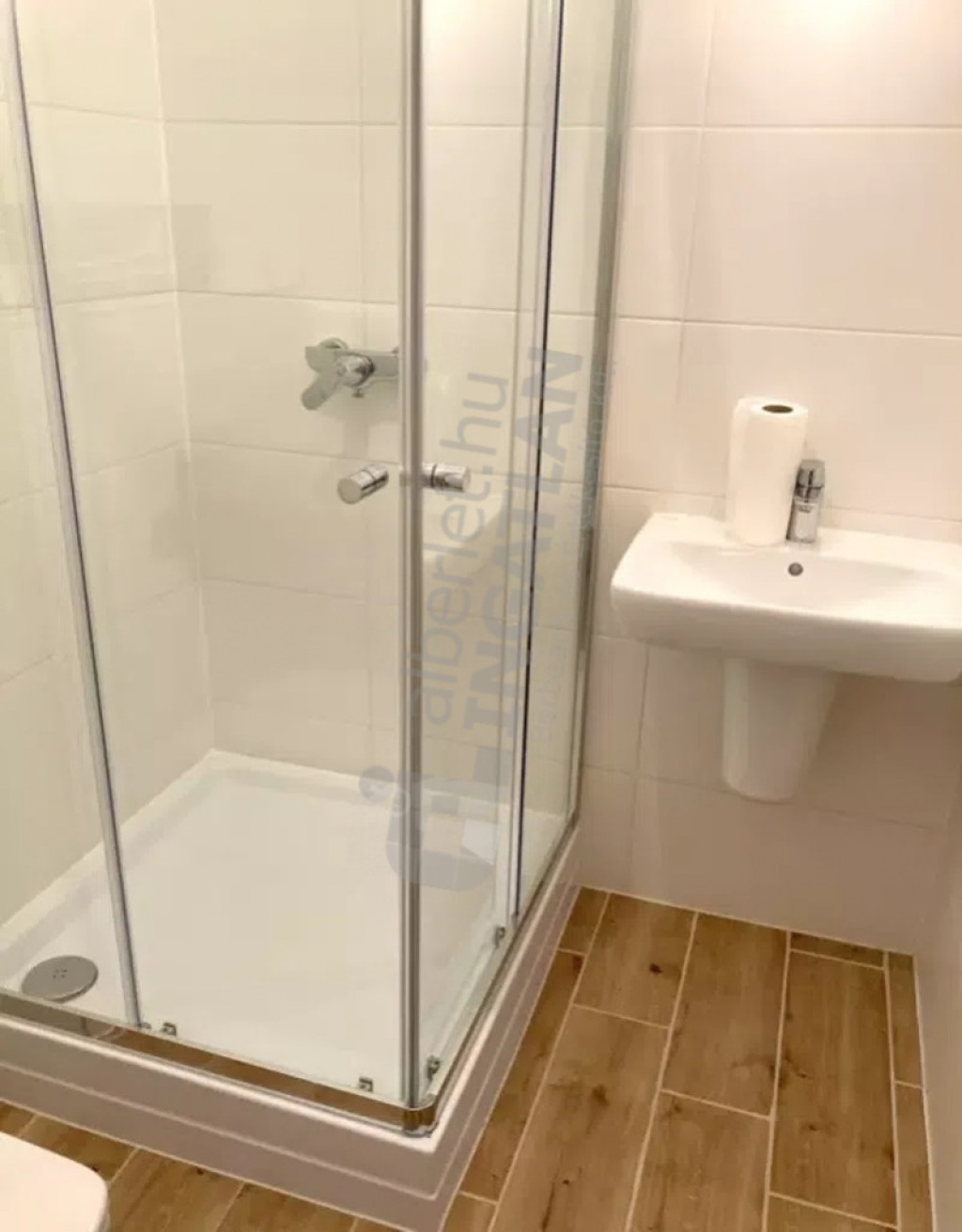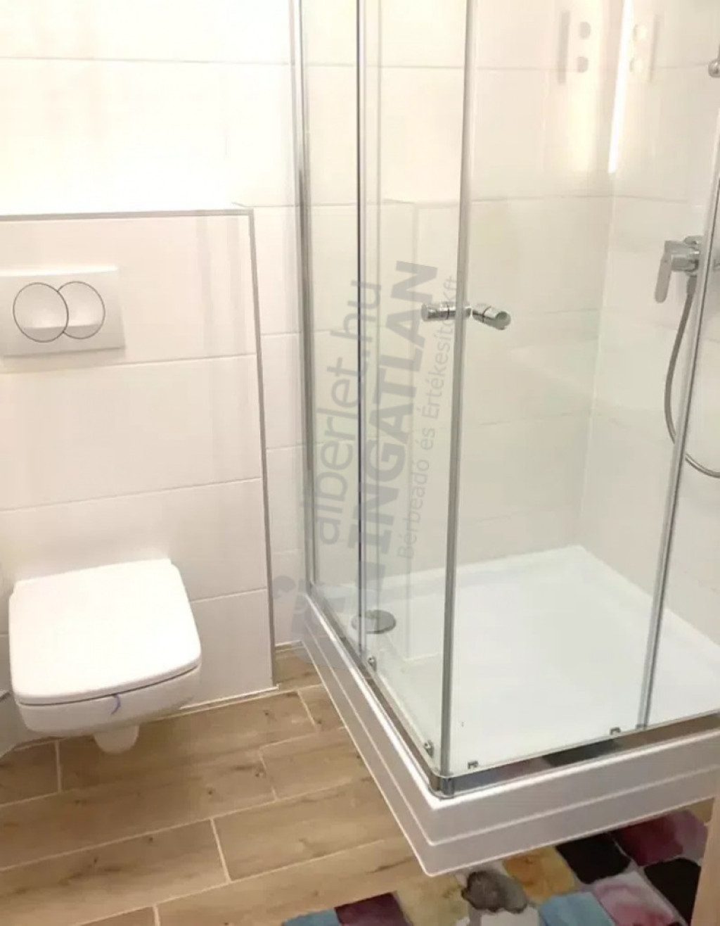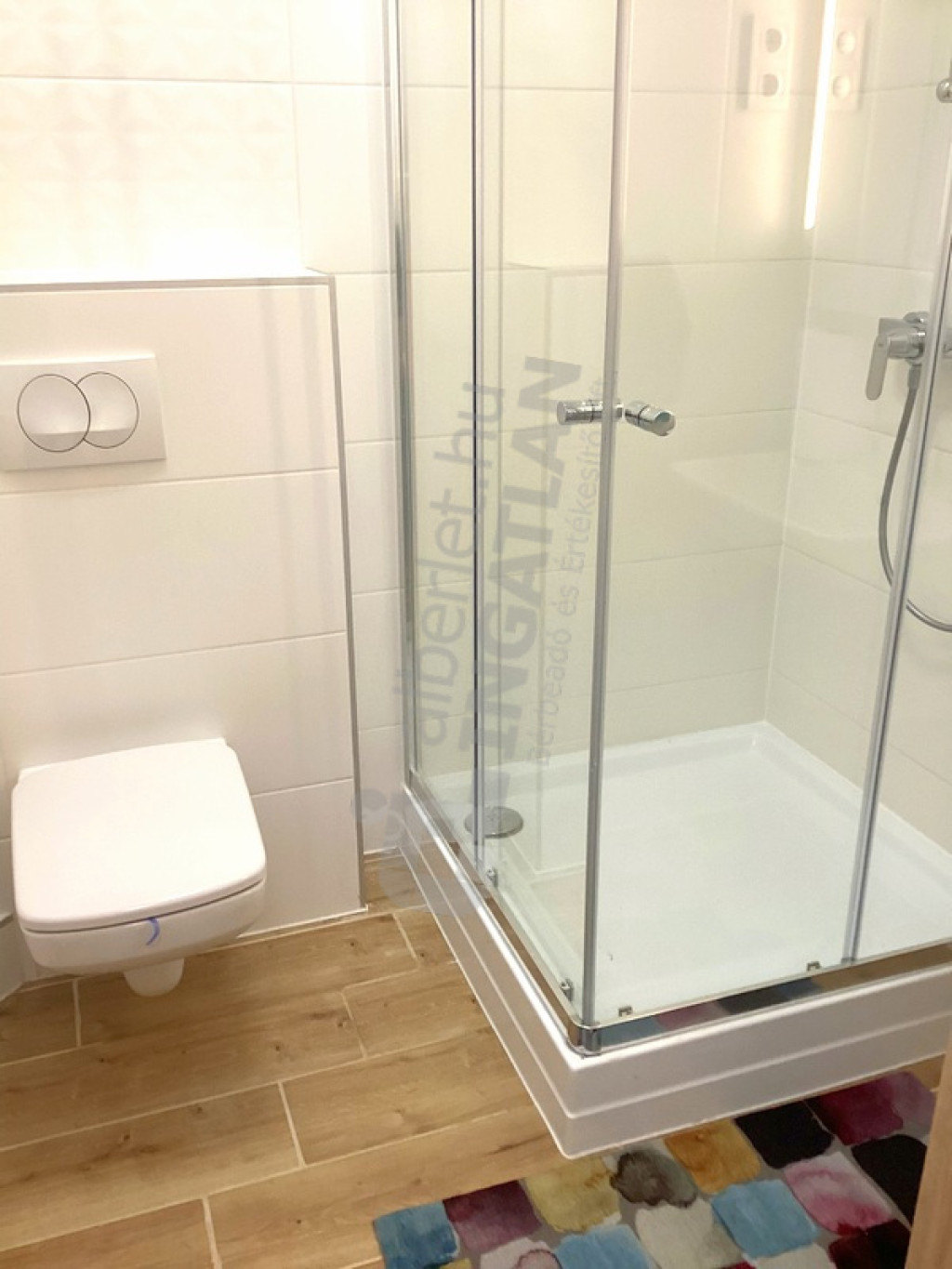 A zuhanyzós fürdőszoba és a wc egy légtérben található, ezen felül itt egy mosó-szárítógép került elhelyezésre.