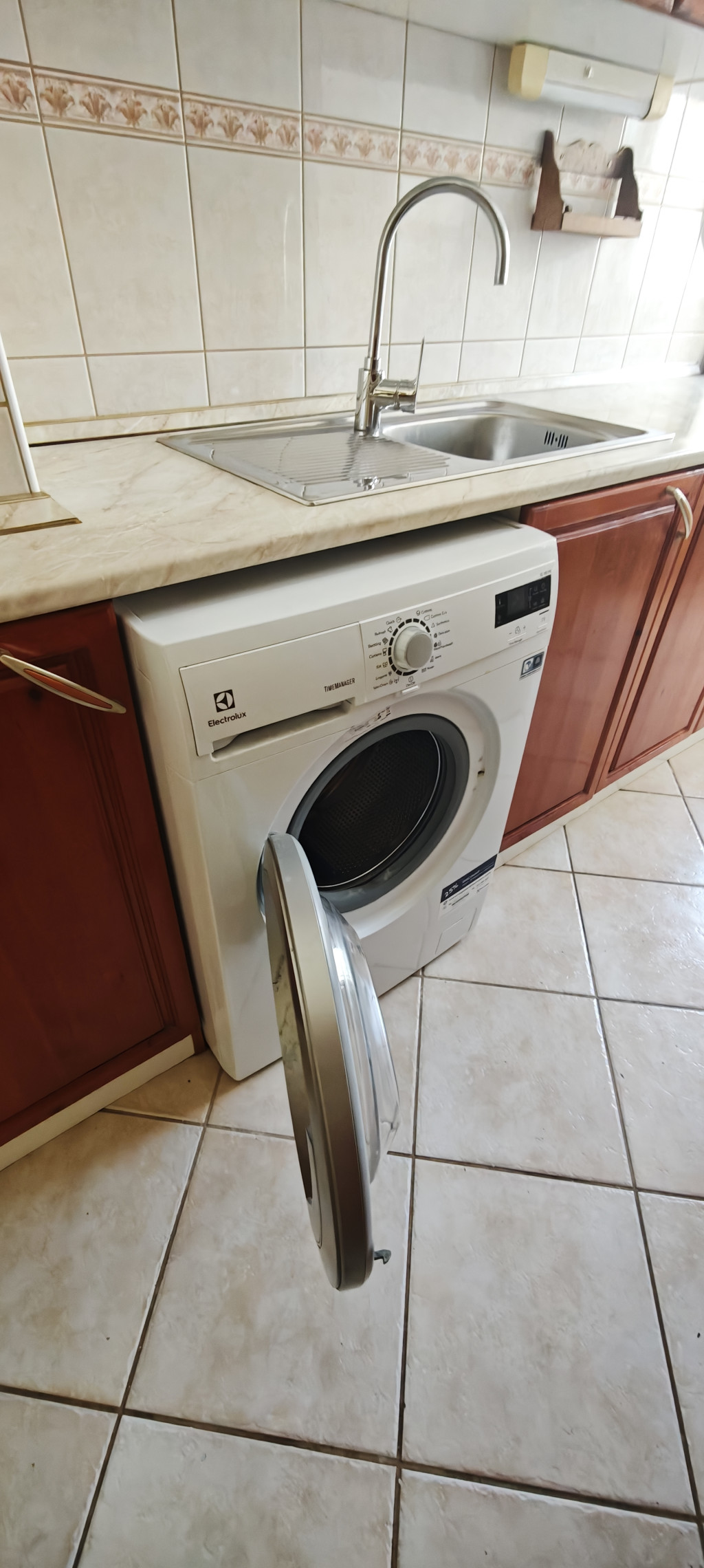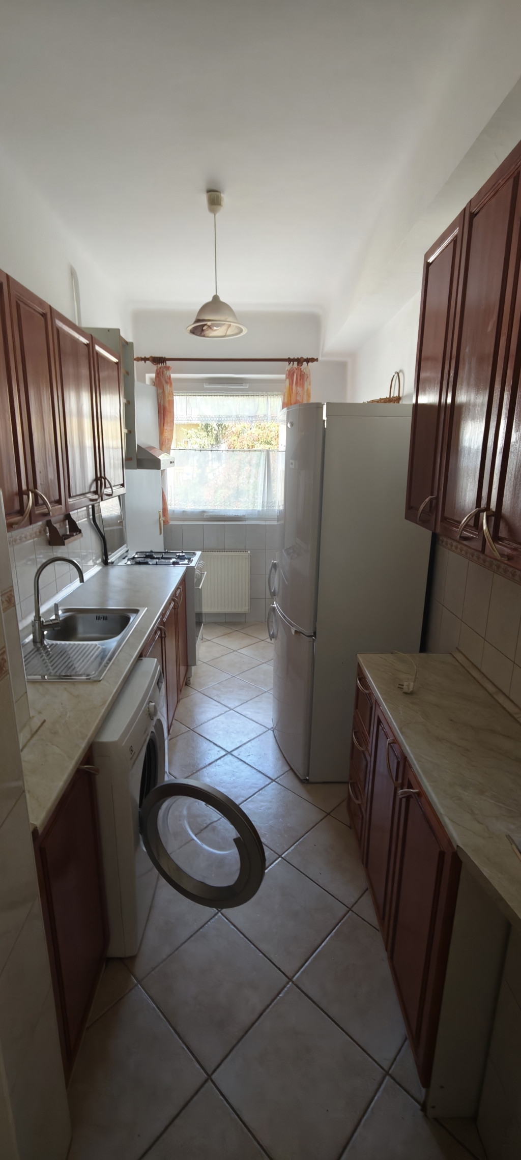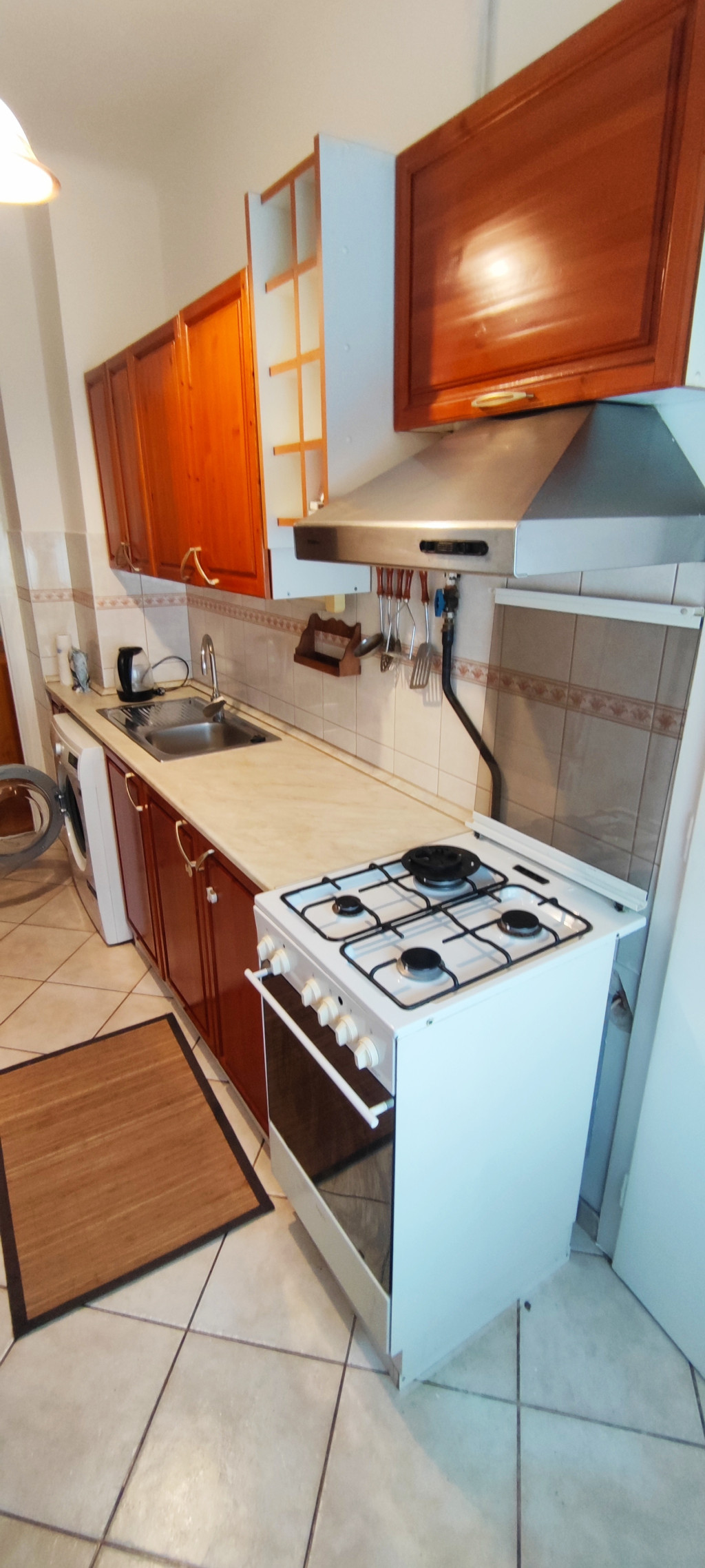 A konyhában a beépített bútorokon kívül van mosógép, hűtőszekrény, tűzhely sütővel.
