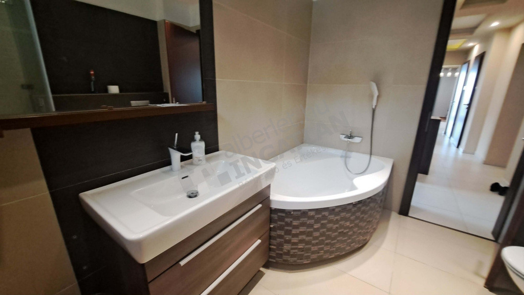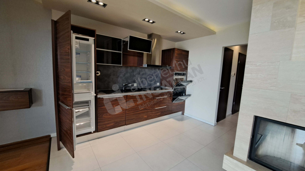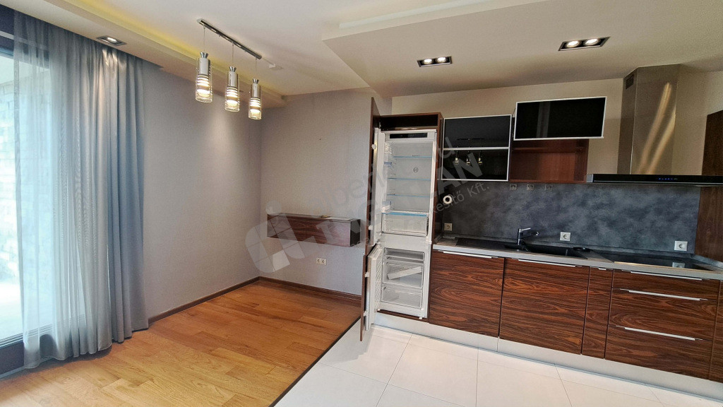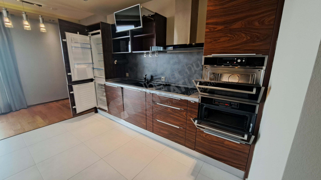 A konyhában kombi hűtő, beépített mikró, beépített sütő, mosogatógép és főzőlap van elszívóval. Padló- mennyezeti hűtés-fűtő klíma van. Riasztóval védett lakás. Mosógép kérésre biztosítható.