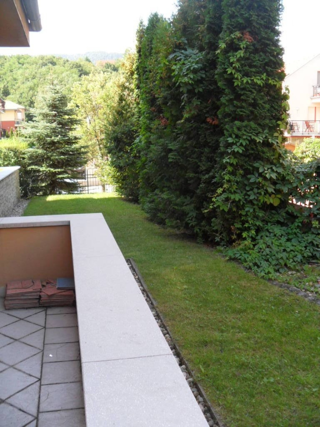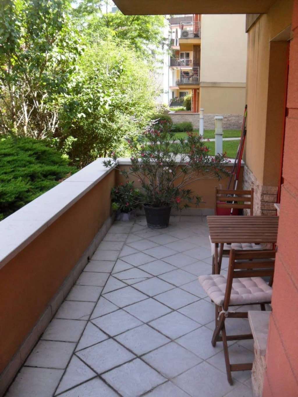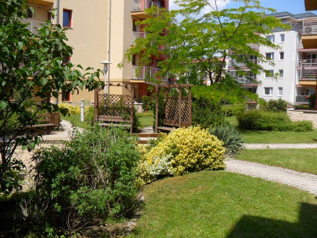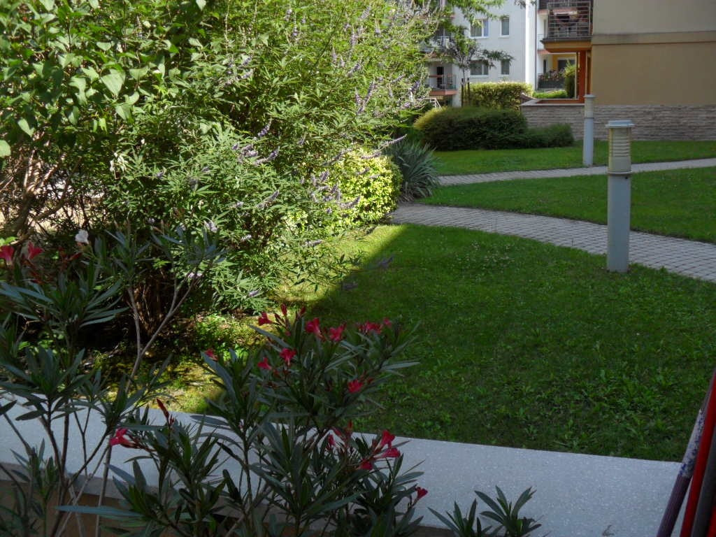 A lakás ablakai és erkélye a ház gondozott, örökzöldekkel és virágokkal beültetett belső kertjére néznek, amelyet kertész ápol. A kert zárt és teljesen védett, így csendes, nyugodt környezetet biztosít.