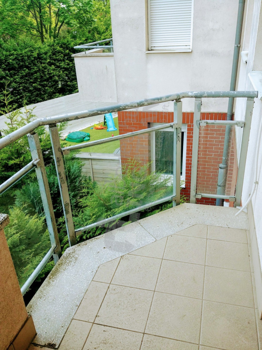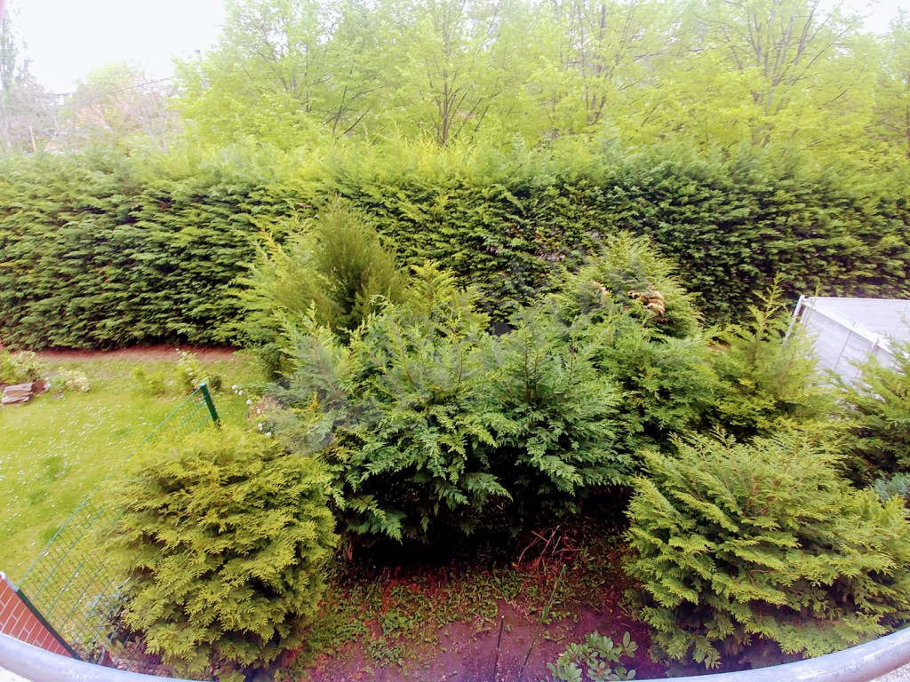 DK-i fekvésű, magas sövénnyel elkerített előkertre - Nánási útra - néz. Az utca így egyáltalán nem látható a lakásból és az utcáról sem látható a lakás.