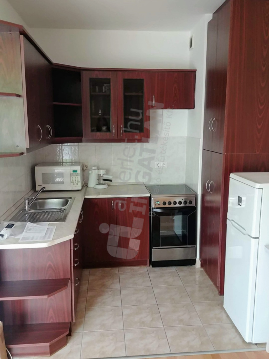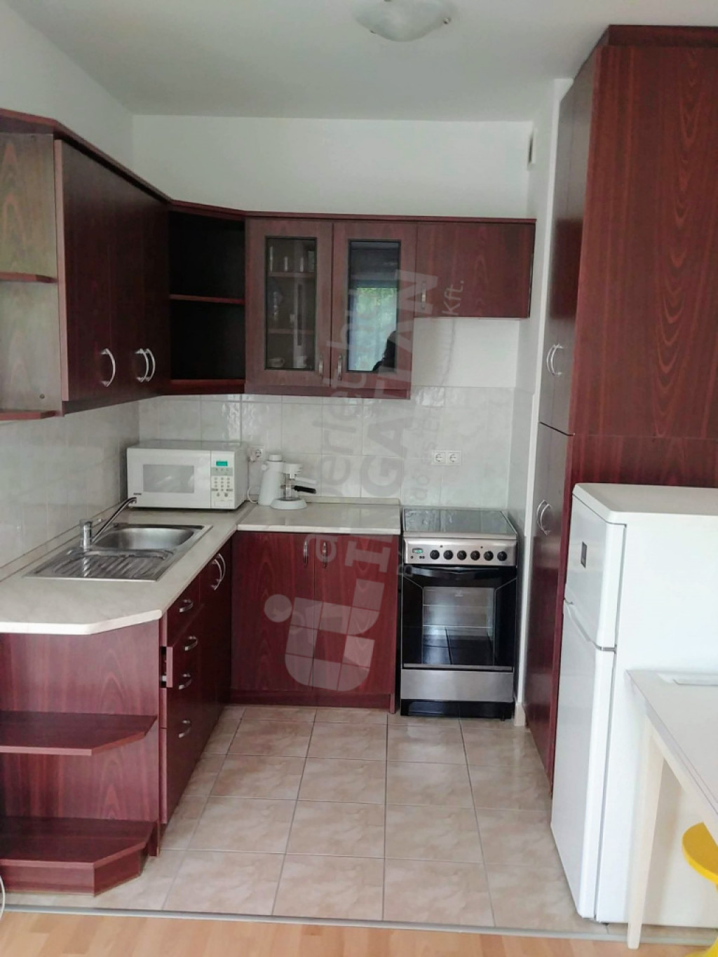 a szobában beépített konyhabútor, villanytűzhely, mikró, kombinált hűtőszekrény,,