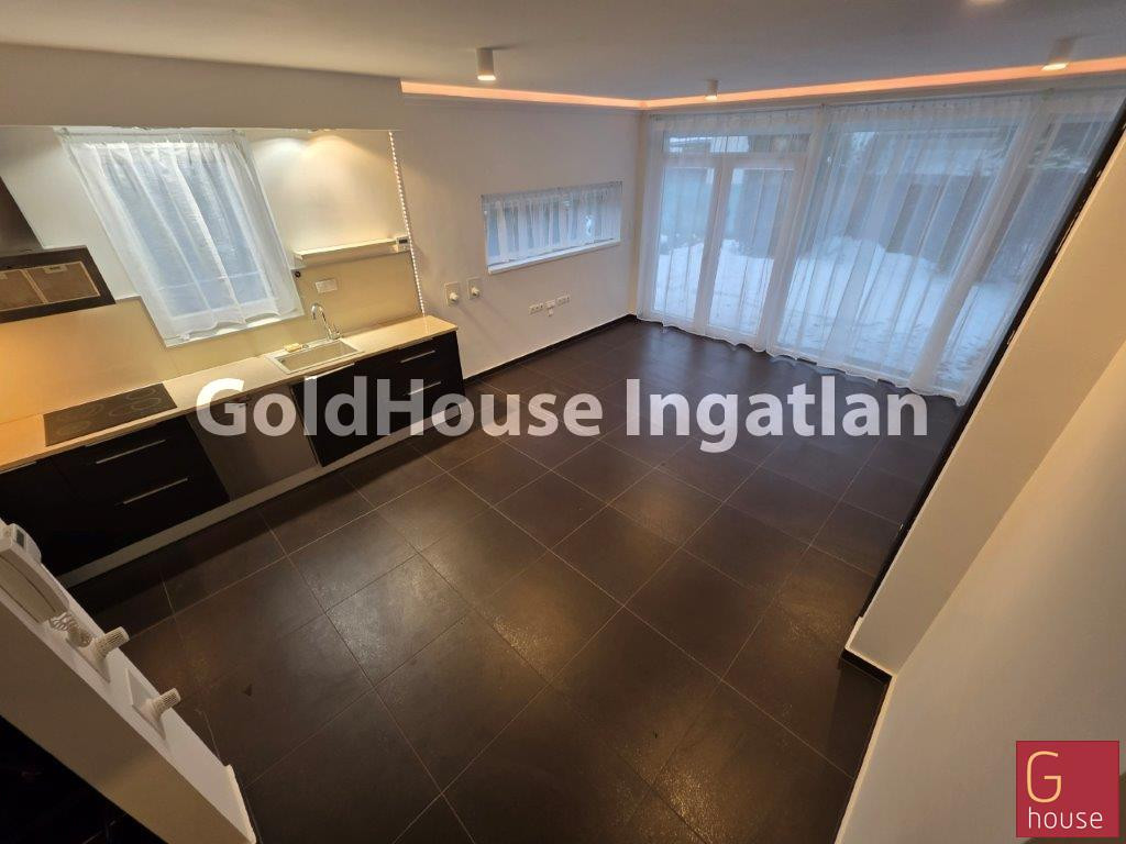 Az alsó szint tágas nappali–étkező–konyha tere egybefüggő, világos élettérként működik, közvetlen kapcsolatban a terasszal és a gondozott kerttel, ahol saját medence, kerti tároló és játszóvár biztosít kényelmet és kikapcsolódási lehetőséget.