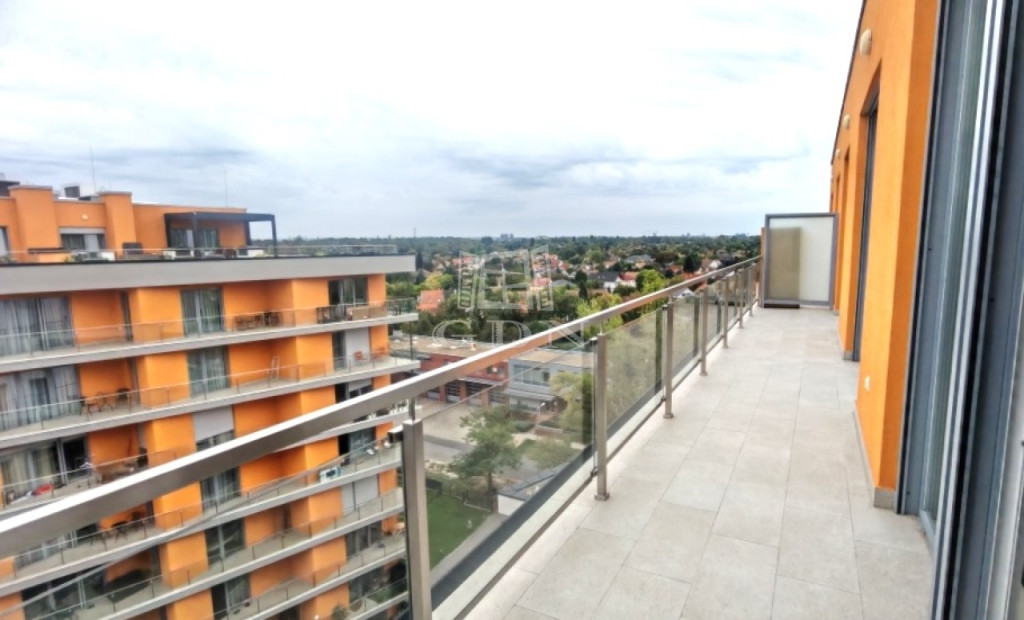 A lakáshoz tartozik egy tágas, 18 m²-es terasz, ahonnan szintén a gyönyörű panorámát élvezheti — minden helyiségből közvetlen kijárat vezet ide.