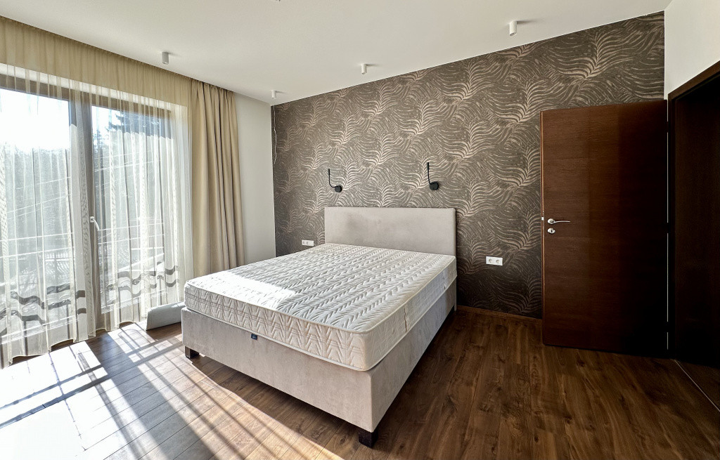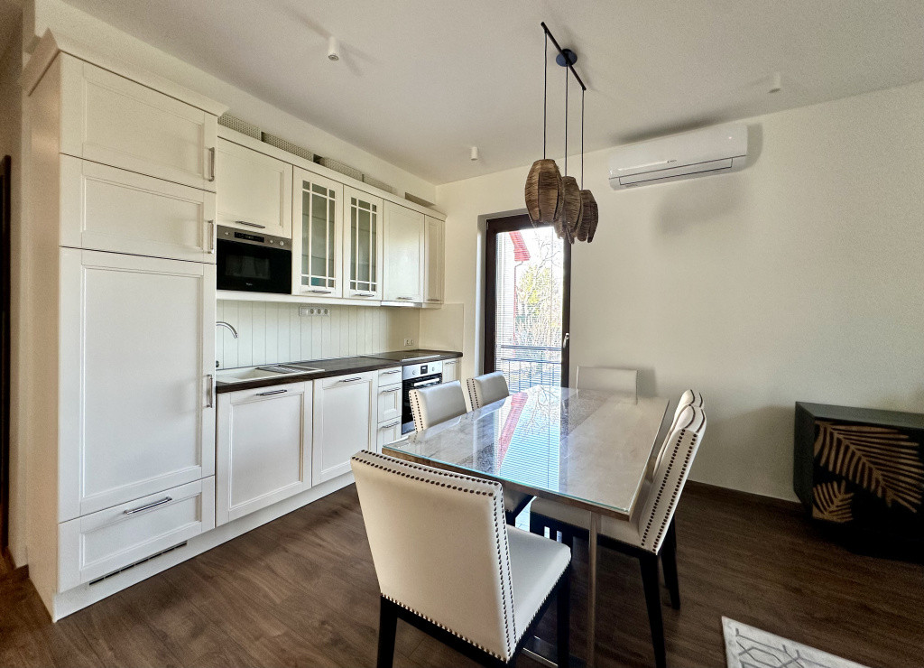 Az ingatlan jól átgondolt elosztású: a kertre néző, világos nappali étkezővel kapcsolódik, mellette két tágas hálószoba található, mindkettőben nagyméretű, beépített gardróbokkal. A lakás vadonatúj, gépesített Nobilia konyhával felszerelt, a hűtés–fűtés korszerű és gazdaságos geotermikus rendszerrel megoldott, a nyári komfortot légkondicionáló biztosítja. Mosógép nem tartozik a felszereltséghez.