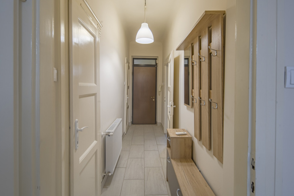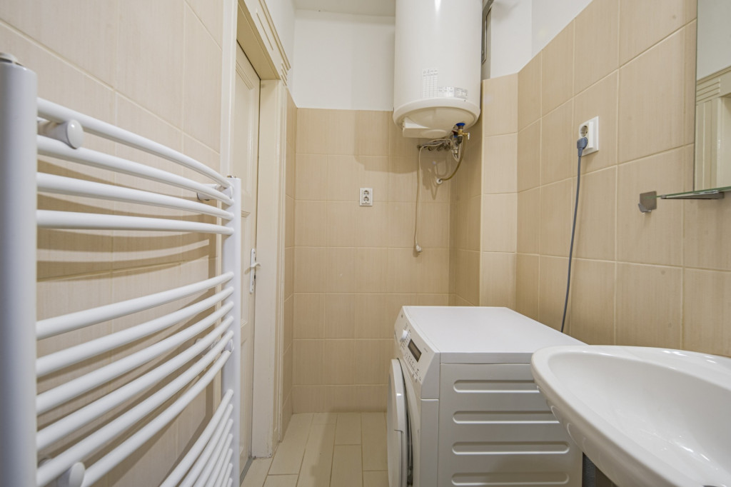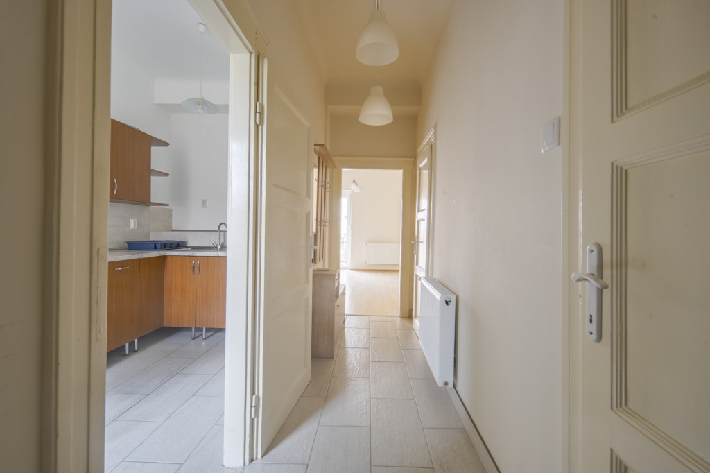 A lakásba lépve egy kényelmes méretű közlekedő található, ahonnan a lakás összes többi helyisége nyílik. Az étkezős-konyha (8.5 m2) kényelmes méretű, ablakkal ellátott helyiség. A fürdőszobában zuhanyzó került kialakításra, míg a WC külön helyiségben kapott helyet. 23 m2 alapterületű szobája okán elsősorban egyedülállóknak ideálisan kialakítható az ingatlan, de párok számára is jó választás lehet. A szoba és az innen nyíló erkély D-i irányba, a csendes Tímár utca felé tekint.