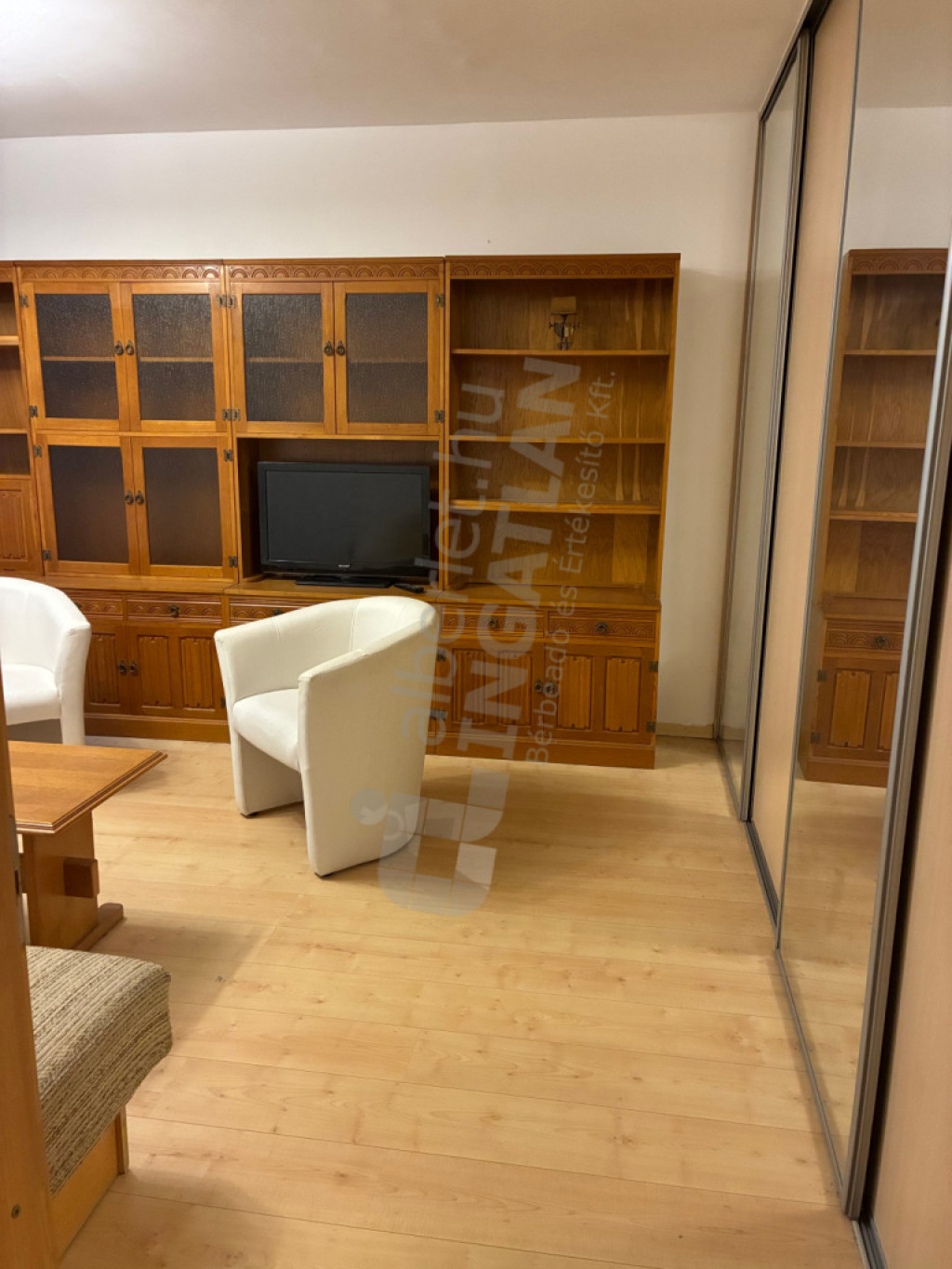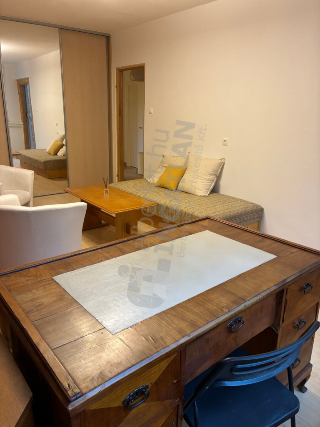 A nagyszobában tükrös gardrób, antik dolgozóasztal és szép, valódi fából készült szekrénysor található.