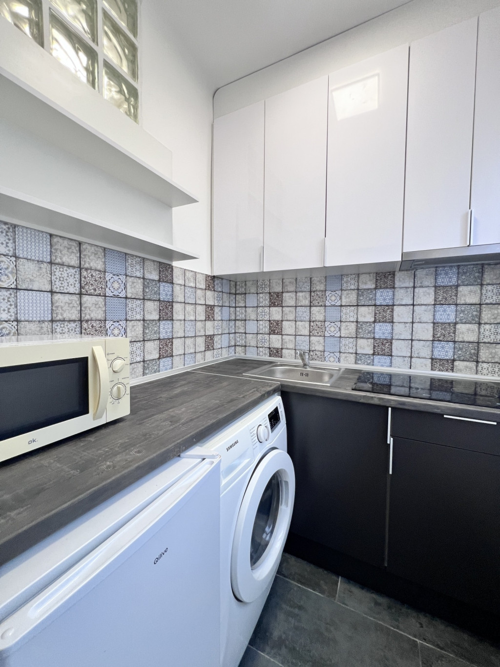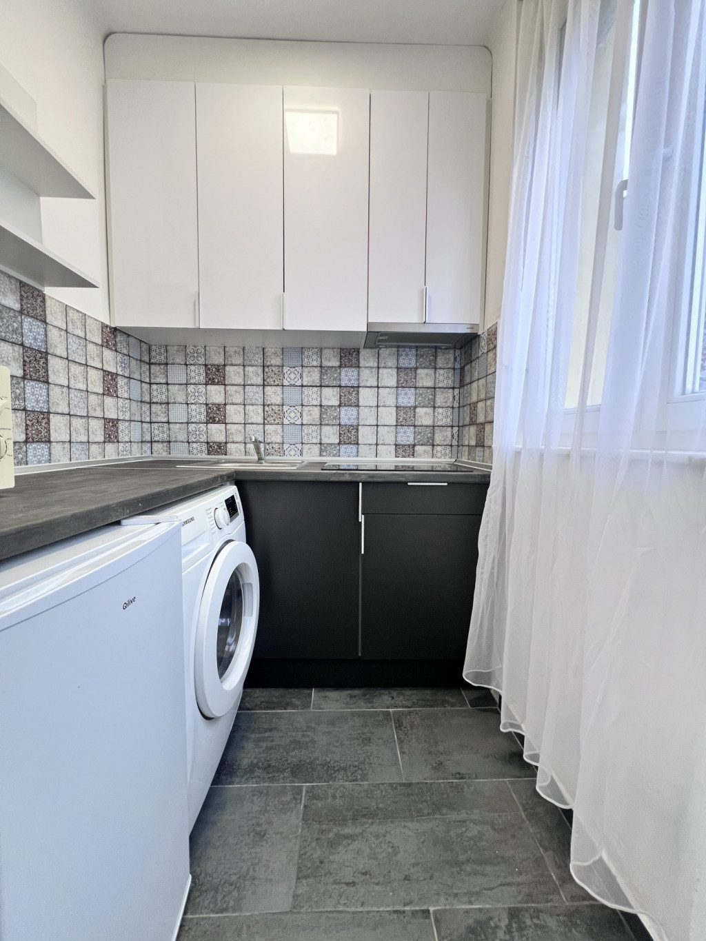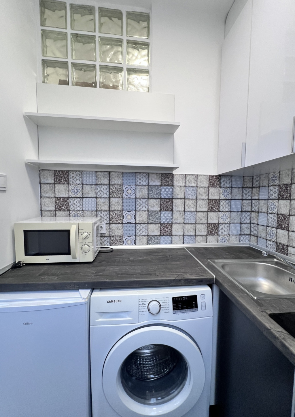 Igényesen BERENDEZETT, RÉSZBEN GÉPESÍTETT (mosógép, tűzhely, kis hűtő, mikró van, sütő és mosogatógép nincs).