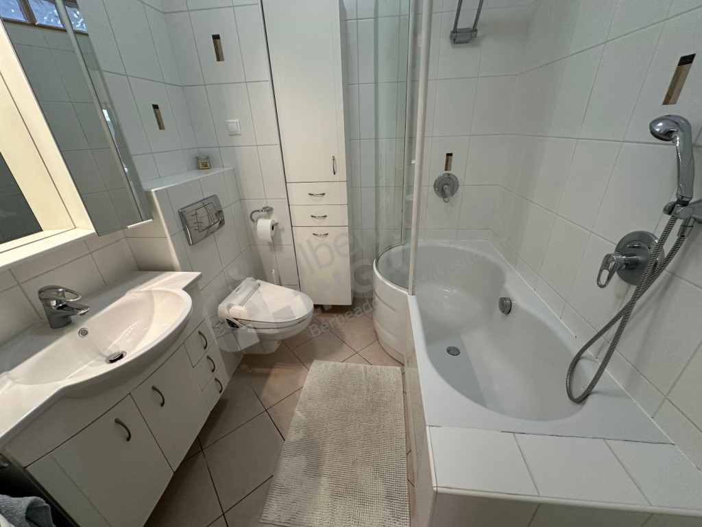 Jól felszerelt, gépesített: AEG mosó-szárítógép, mosogatógép, LUX vízszűrő, Nespresso kávéfőző, étkészlet, poharak, ágynemű, törölköző, légkondi, grillező.