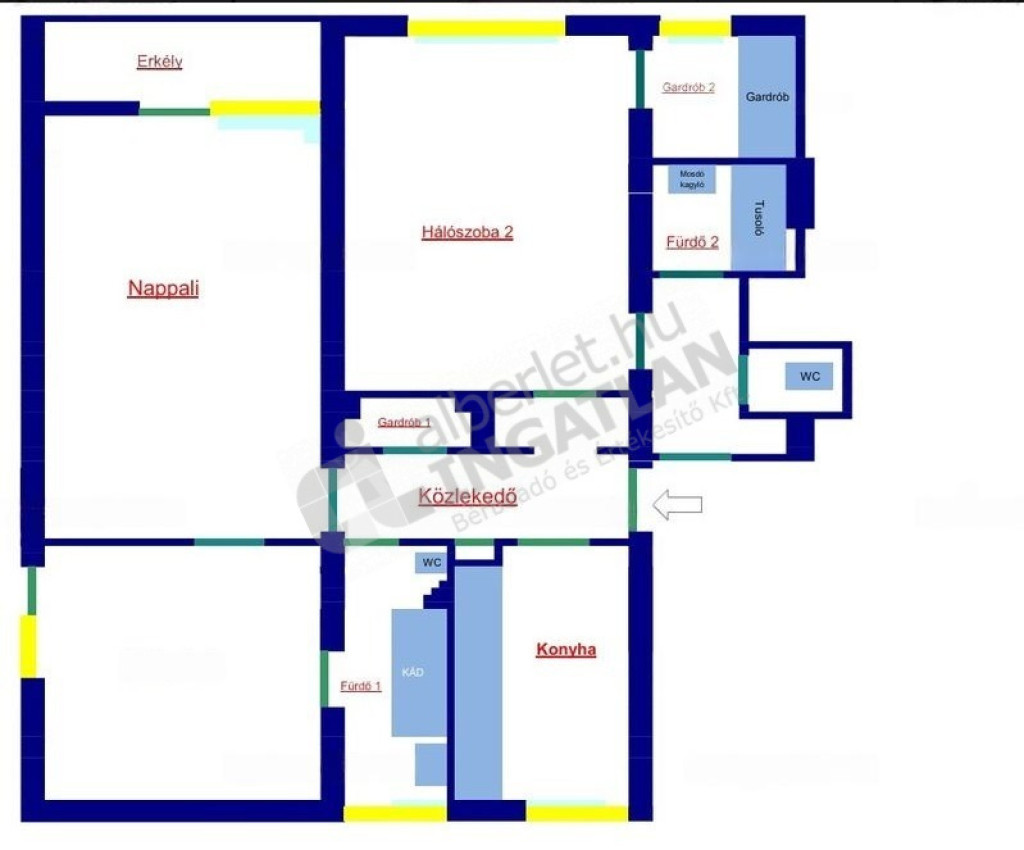 Dupla gardrób, két fürdőszoba, két erkély, gépesített konyha, két klímaberendezés, mosó-szarítógép.