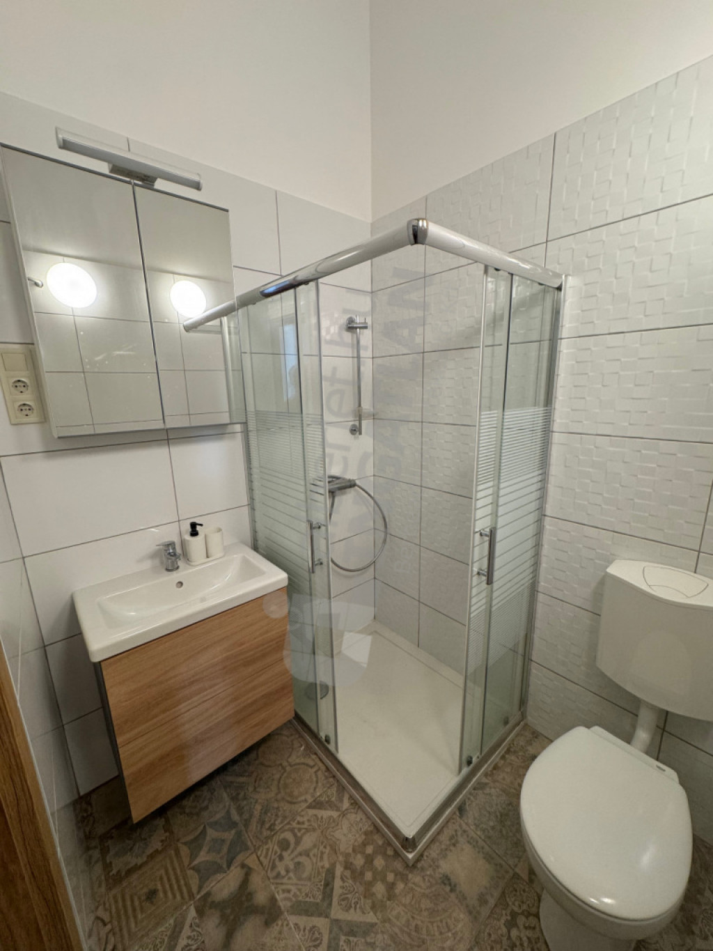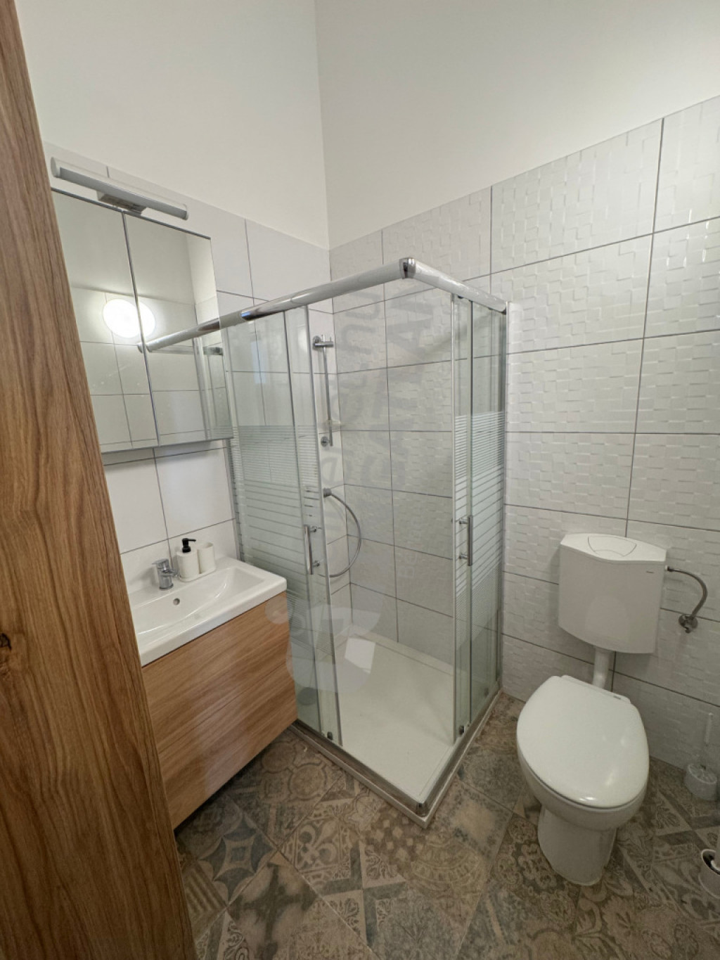 Konyha és zuhanyzós fürdőszoba WC-vel.