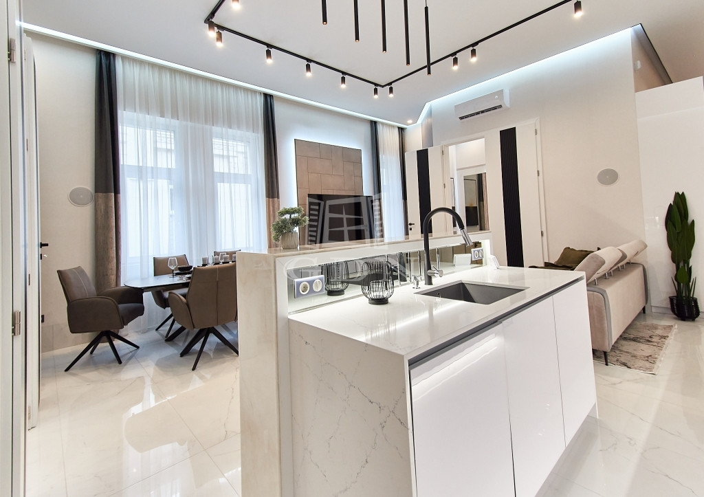 V. kerületben, az Aranykéz utcában, kiadó egy 121 m2-es, 3 szobás (2 háló + amerikai konyhás nappali), ERKÉLYES, dupla komfortos, egyedien és PRÉMIUM minőségben felújított EXKLUZÍV, LUXUS lakás.