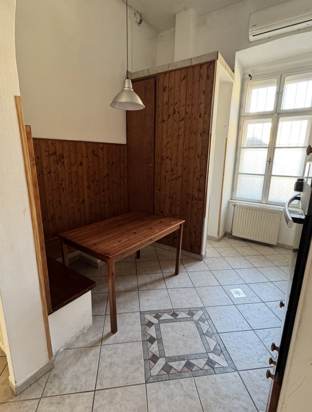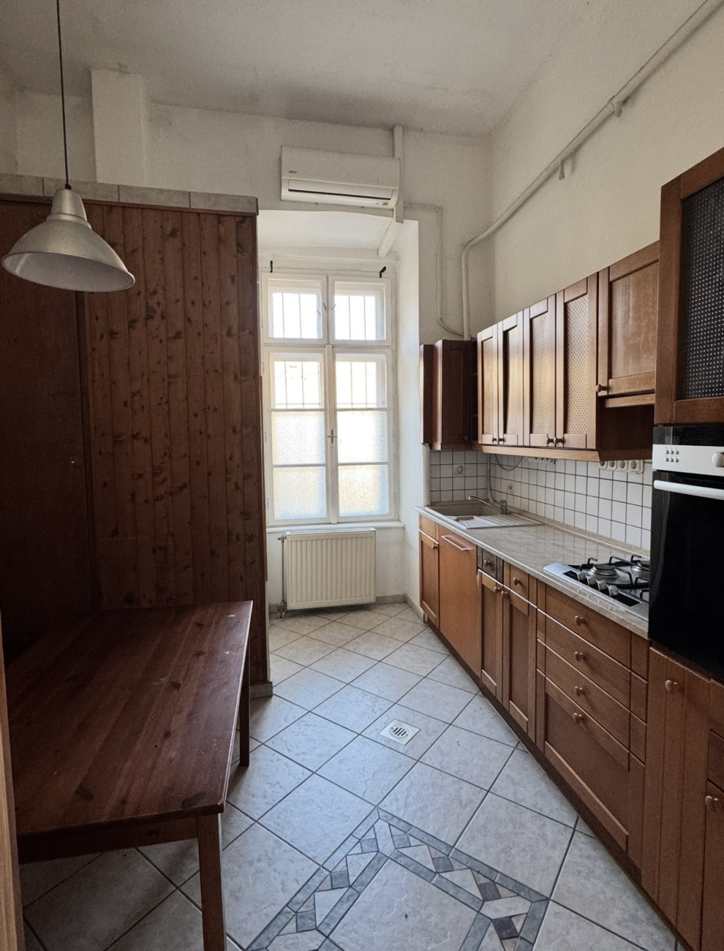A lakás alapvetően bútorok nélkül kerül kiadásra, a konyhában található étkezőasztal, székek. Részben utcai, részben belső udvarra néző kilátású. Elosztása miatt például egyetemisták számára is ideális lehet.