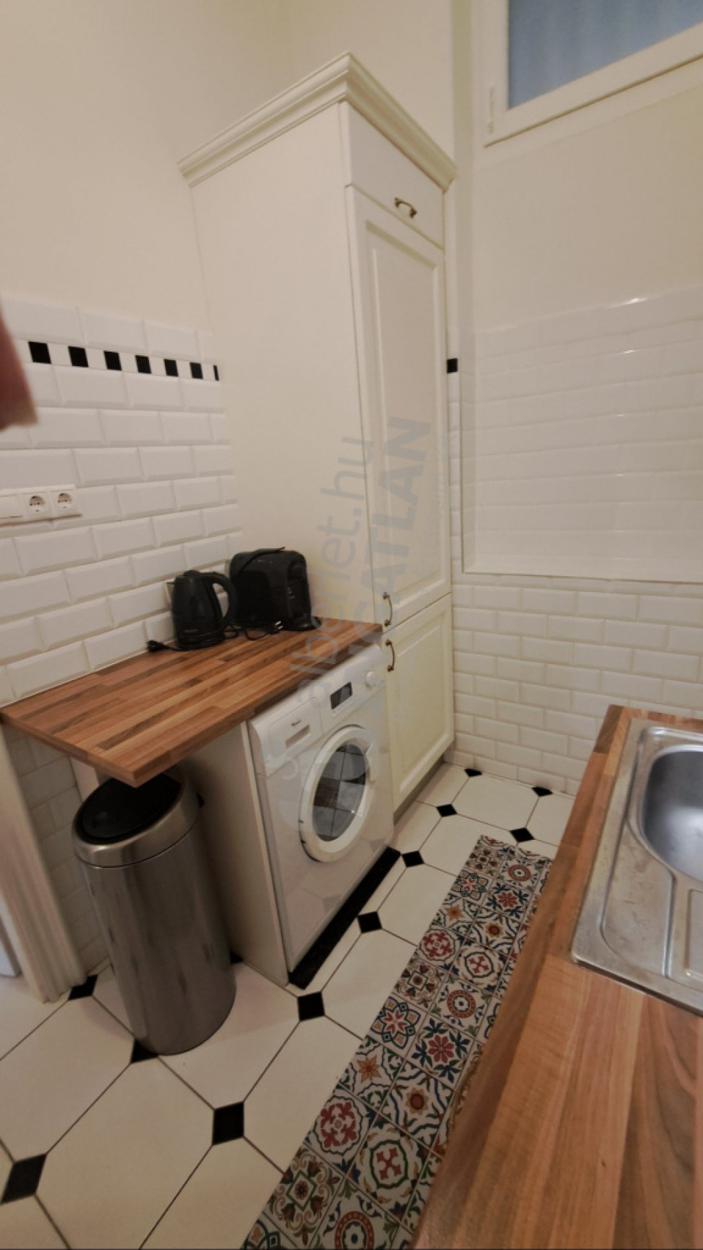 A konyhában kombi hűtő, beépített mikró, mosógép, mosogatógép főzőlap van elszívóval