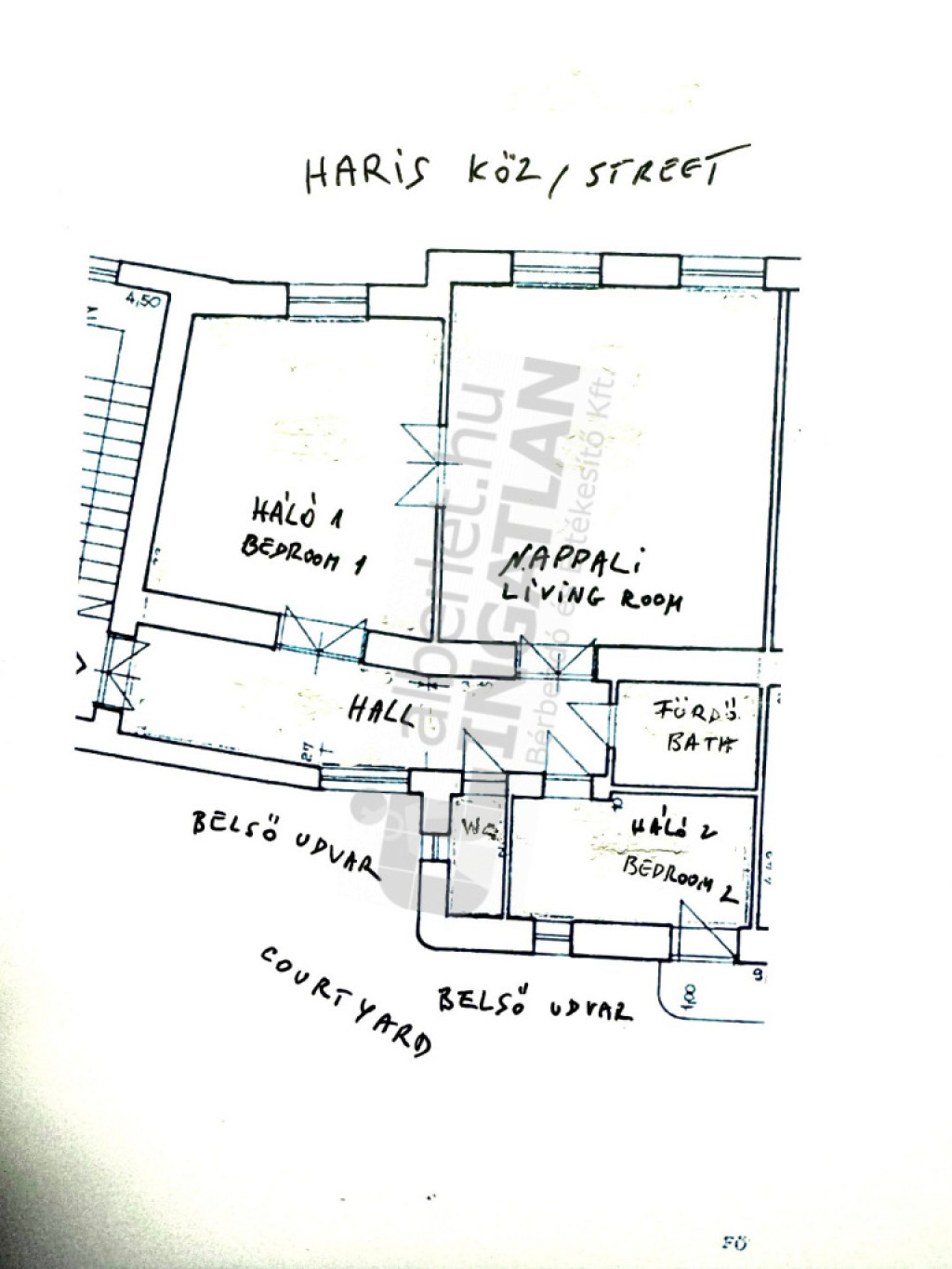 Egy nagyobb (24m2), és egy kisebb (12m2) hálószoba, a nappali és az egyik háló a Haris közre, a második szoba ablaka belső udvarra néz.
