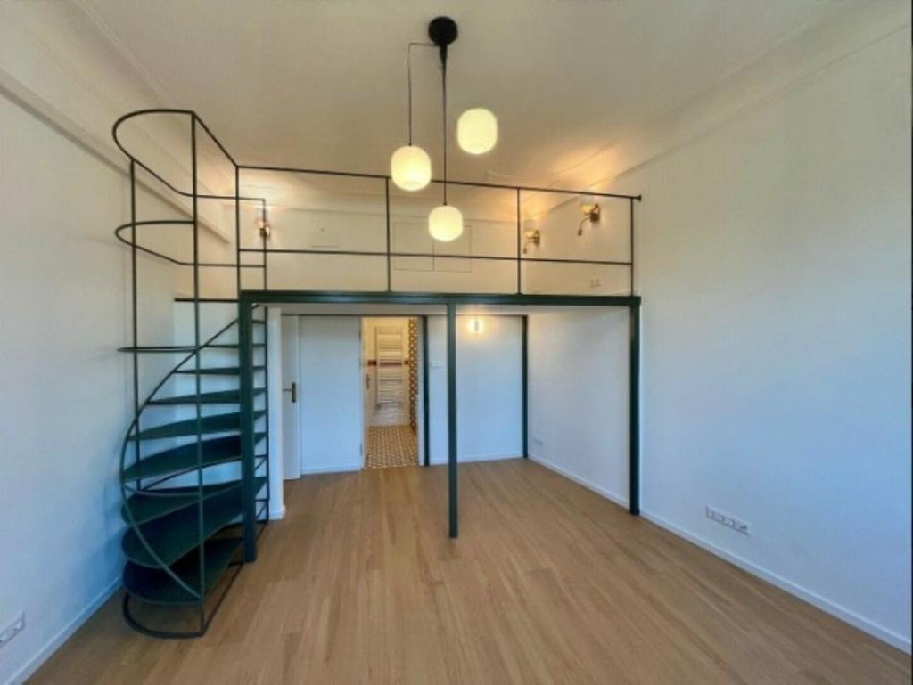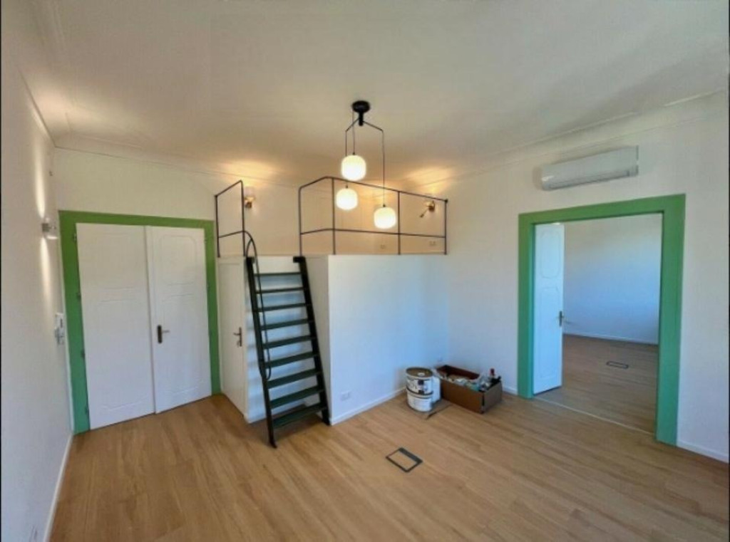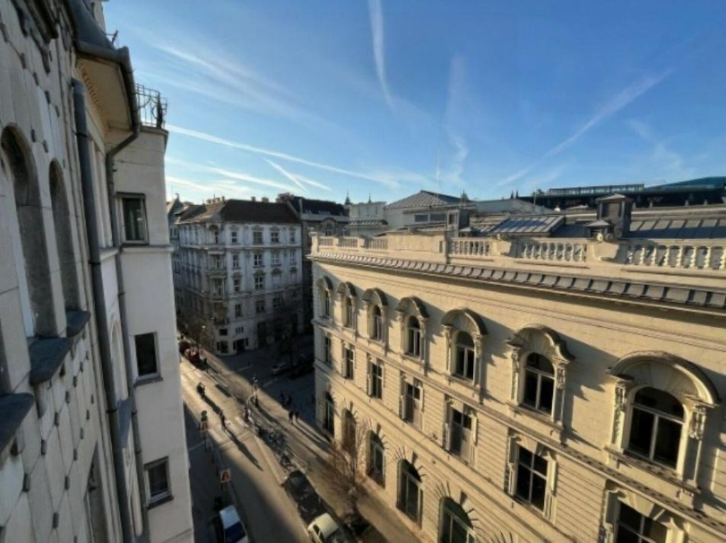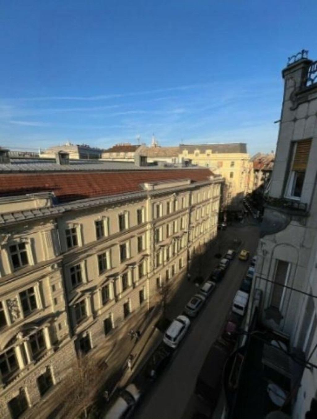 A lakás világos, nagy belmagasságú, utcai kilátással.