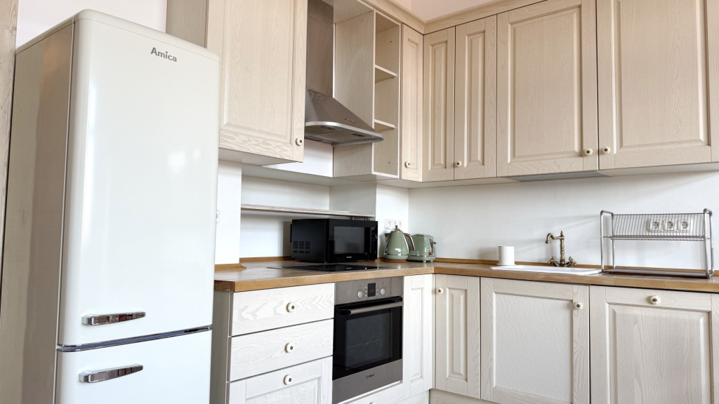 A lakás nappalija amerikai konyhás, 1 hálószobával és egy előszobából nyíló fürdővel rendelkezik WC-vel együtt, egyedileg tervezett beépített szekrényekkel felszerelt.