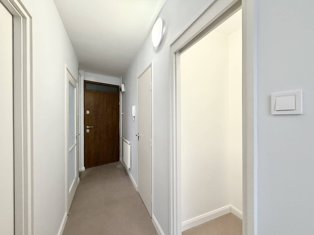 A lakás 50 m2-es, modern, felújított állapotú, a társasház 3. szintjén helyezkedik el. Az elosztását tekintve az előtérből közelíthetjük meg a nappalit, a konyhát, az egyik hálószobát, valamint a fürdőszobát és a külön wc-t is. A közlekedő és a fürdőszoba között egy beépített gardróbszekrény is helyet kapott.